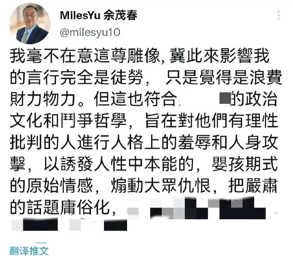 恭喜大汉奸余春茂,终于有了属于自己的雕像! 原以为余大汉奸会装死没看到自己的雕像,想不到他竟然发现了,还文绉绉的之乎哀哉,一副毫不在意的样子,实际上是急了但确实无可奈何,一个人再不要脸也见不自己这般被羞辱,而且是世世代代被唾弃,这就是当汉奸的下场! 想毕大汉奸一定非常享受以后每天被人扇耳光、吐唾沫星子、砸石头的待遇!更无上荣光能和秦桧、汪精卫等老牌汉奸们的雕像并驾齐驱!余大汉奸就这样被世世代代给记住了,公知们拼尽全力没有实现的事情大汉奸轻轻松松搞定,这下应该满意了吧!