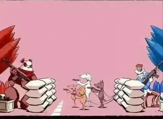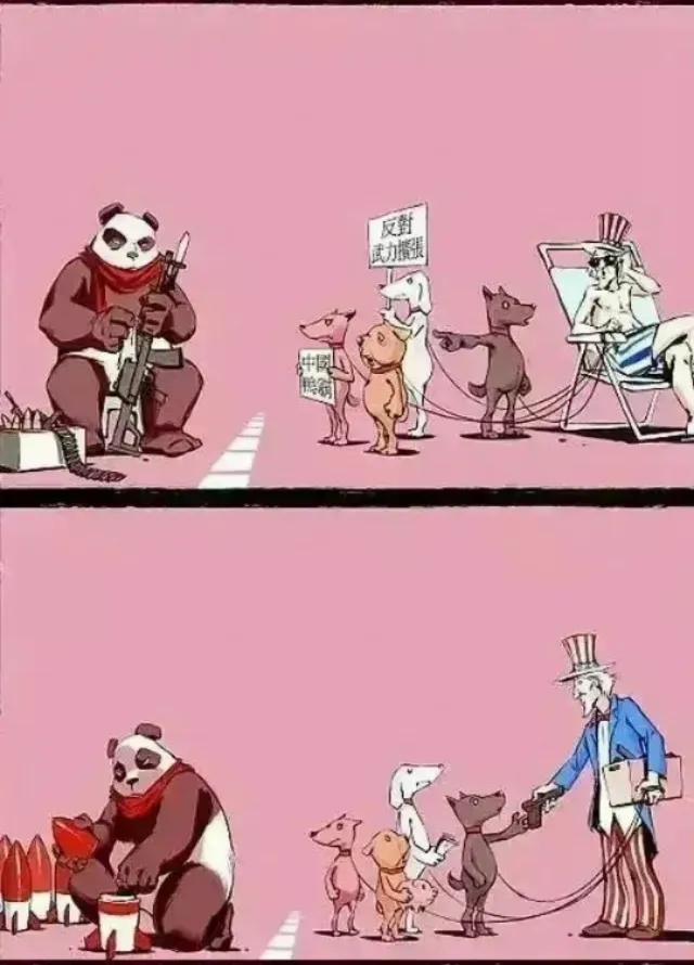 这是我看过对中美关系表达的最清楚的一组漫画。有意思的是美国养的4条狗,我猜白色可能是澳大利亚,黑狗是日本,粉红狗是菲律宾、剩下的那只沙皮狗应该就是韩国。