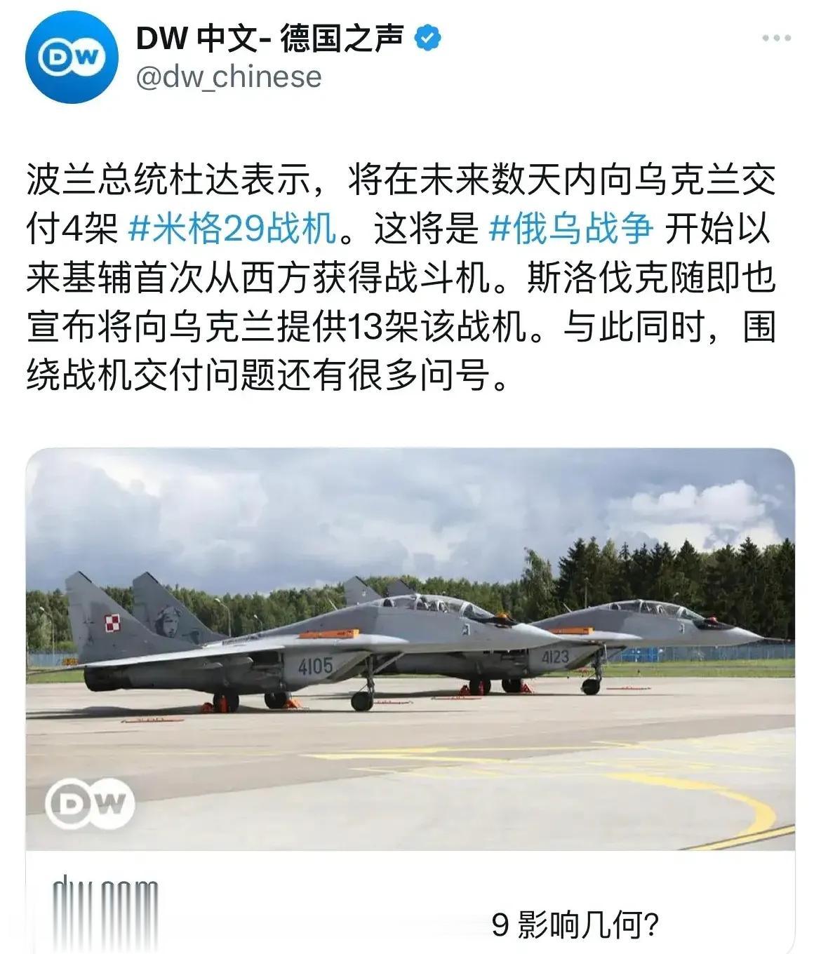 继坦克之后北约开始向乌克兰大规模提供战机,先是波兰总统宣布将在未来几天向乌克兰提供4架米格29战机,随即斯洛伐克也宣布向乌克兰提供13架米格29战机。而据华盛顿邮报报道拜登已经同意向乌克兰一次性提供20架F16战机。这一系列的举动都表明,继大规模向乌克兰提供坦克之后,北约各国又开始集中向乌克兰提供战机,如果提供的飞机数量进一步增加,将大大增强乌克兰的进攻能力,甚至可能改变俄乌战场局势,对俄罗斯来说,再不尽快结束战争恐怕面对的局势将会越来越难。