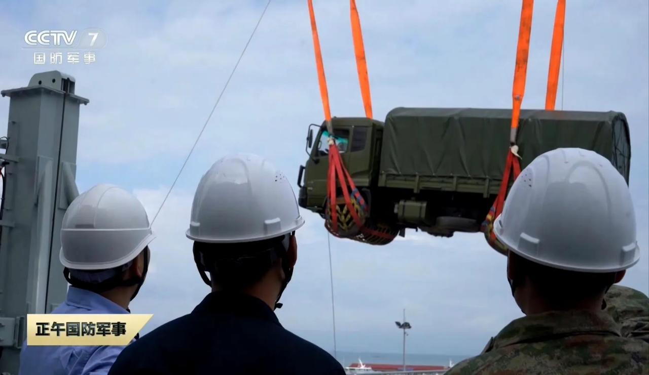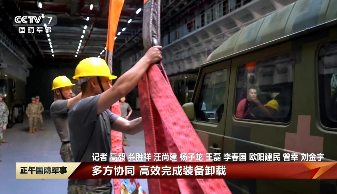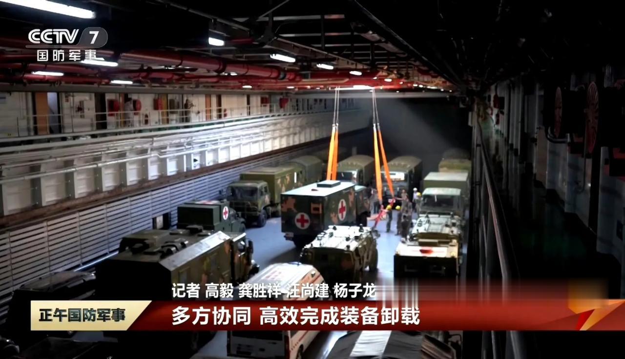 071型登陆舰装备卸载,近日官媒曝光了我国071型井冈山号登陆舰执行装备卸载作业的画面,不同以往的船尾出舱,这次采用了从直升机甲板开口处吊装出坞舱的方式。可以看到在071的直升机甲板处有一个巨大的可活动的盖子,打开之后可直接联通下面的坞舱,舱内的车辆通过岸上的巨型吊臂吊运出船舱,整个过程有条不紊。不过这种出舱方式也有很大问题,在战时武器装备的出舱效率太低,太慢,并且需要依赖吊装设备。