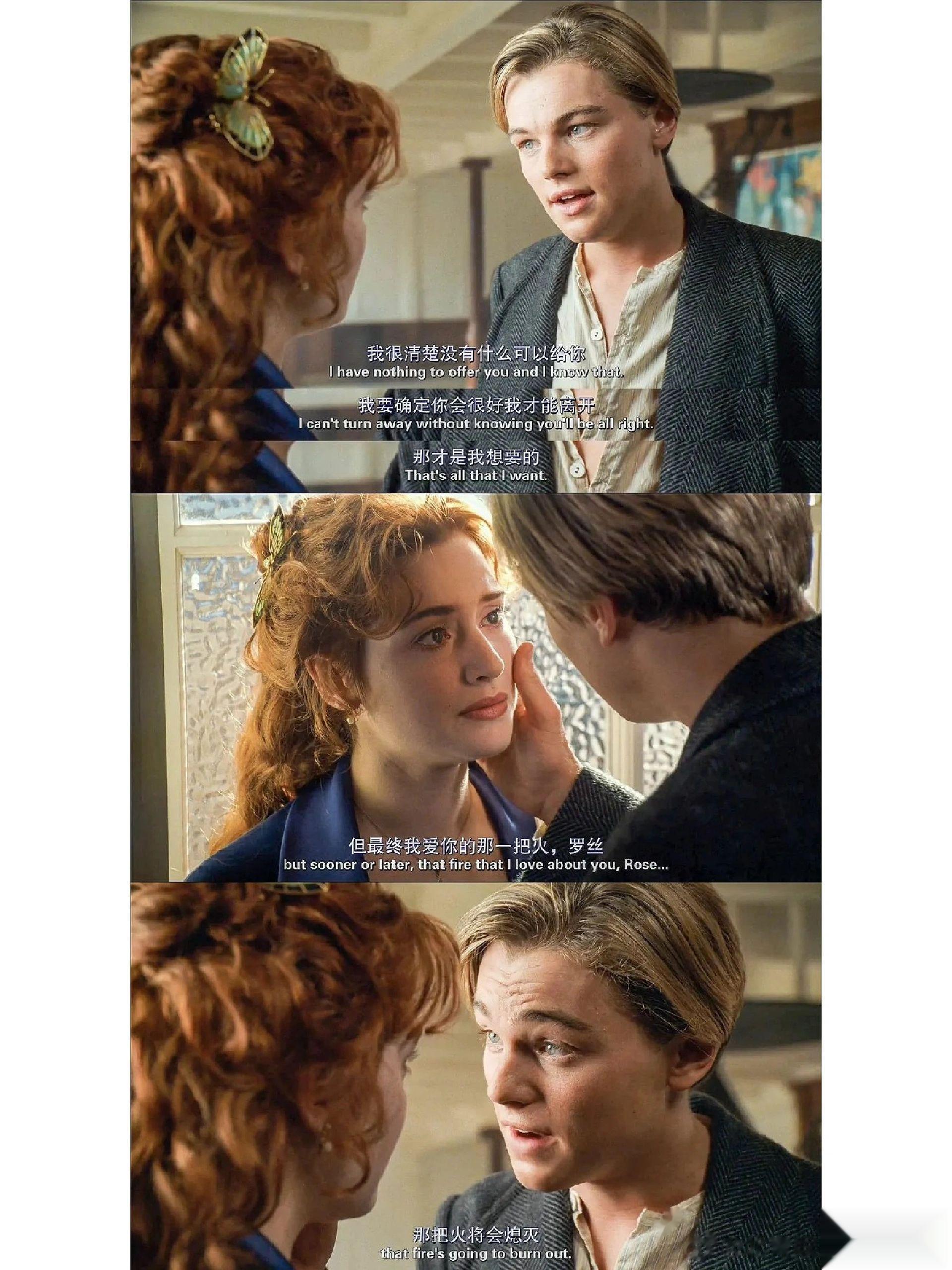 我的孩子都到了我看《泰坦尼克号》的年纪了。漂泊几十载,从身无分文,奋斗到负债累累,上有老下有小,我累了!真的累了!!爱情,得不到的永远是最好的!当初如果杰克和露丝都活下来了,然后结婚生子,天天财米油盐酱醋茶,早晨起来两个满嘴异味还有眼屎,头发一团糟,后面不用说了吧……那电影就没意思了。