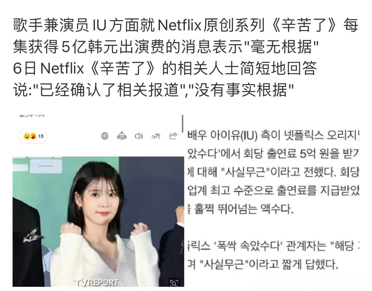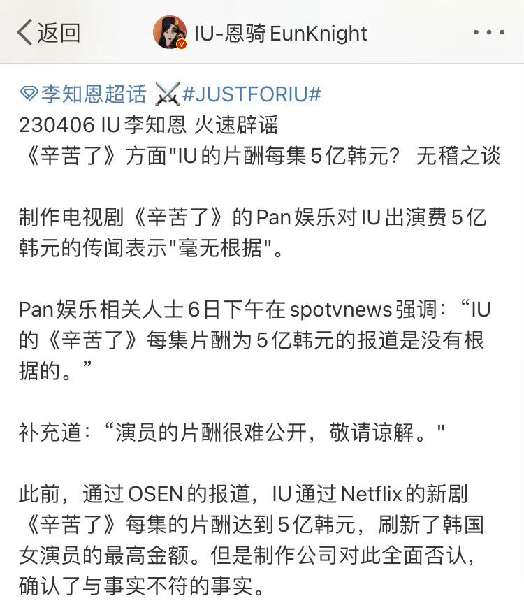 #IU成韩国片酬最高女演员#IU辟谣拍摄电视剧每集5亿韩元片酬,这个片酬在国内是