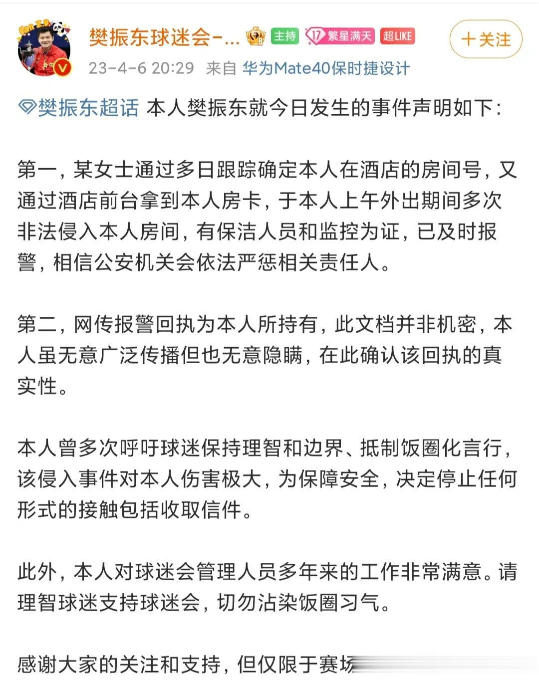 饭圈粉丝偷闯入樊振东酒店房间,樊振东已报警 这一次,饭圈粉丝的丑陋行为,很可能樊振东让对所有粉丝都会敬而远之,樊振东也表示:以后连信件也不会收,彻底和粉丝拉开距离。 樊振东这次做的特好,所有打扰到你的饭圈粉丝,并不是真的球迷,我相信能让你脾气这么好的人选择报警,那它一定是干了很坏的事情。就是要让坏人付出代价,希望不会再有人打扰到你了。 还有就是东哥啊,你检查一下杯口、毛巾、口罩这些容易和口腔接触的地方,以防万一。 总之很心疼你被打扰,但是还是想说,大多数球迷绝对不是你讨厌的那种人,饭圈粉丝还是极少数的那部分人。