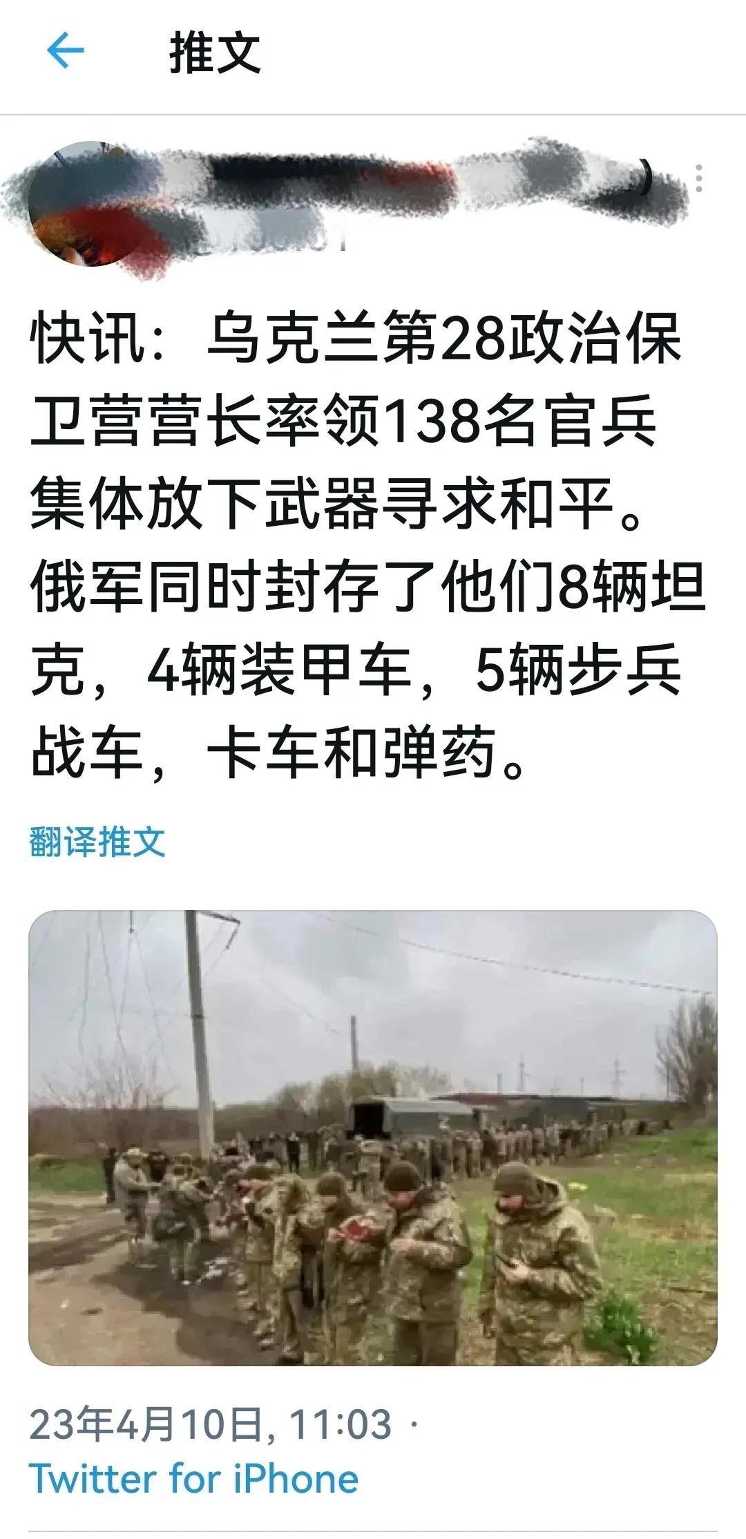 恭喜这138名乌军,要去西伯利亚种土豆了! 在营长的带领下,这138名乌军终于活命了!4月9日,在乌军第28营政治保卫营营长的带头率领下,乌军138官兵放下武器向俄军投降!与此同时,他们还带来了8辆完好无损的坦克、4辆装甲车、5辆步兵战车、还有卡车装载着弹药!俄军这回真是收货丰厚,没费一枪一弹就把这么多武器弄到手,不知道里面有没有豹2,有的话几百万美元就到手了!