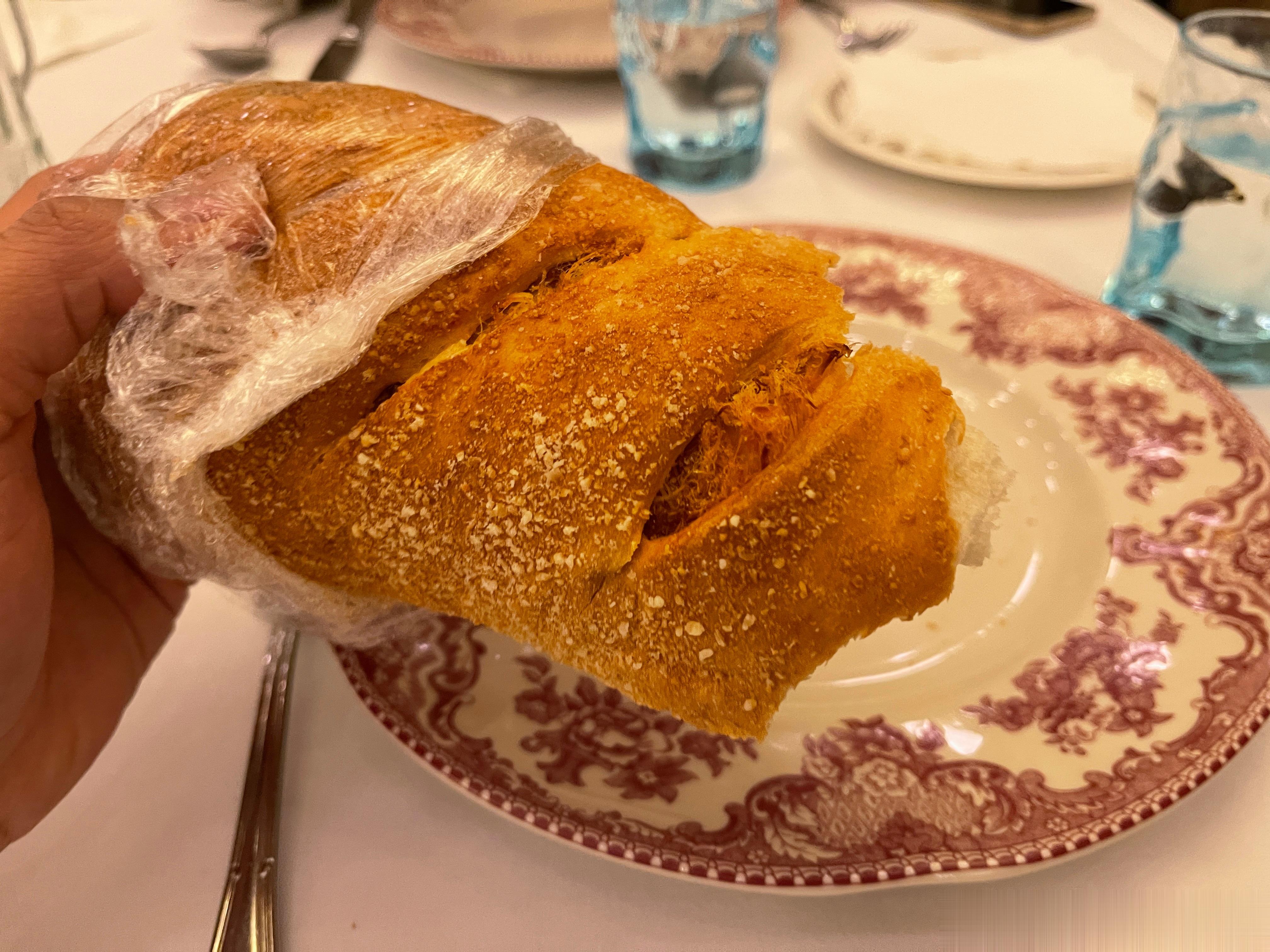 来吃老莫,门口买了个大面包带进来了!哈哈哈哈!还不用给10%的服务费!赢!