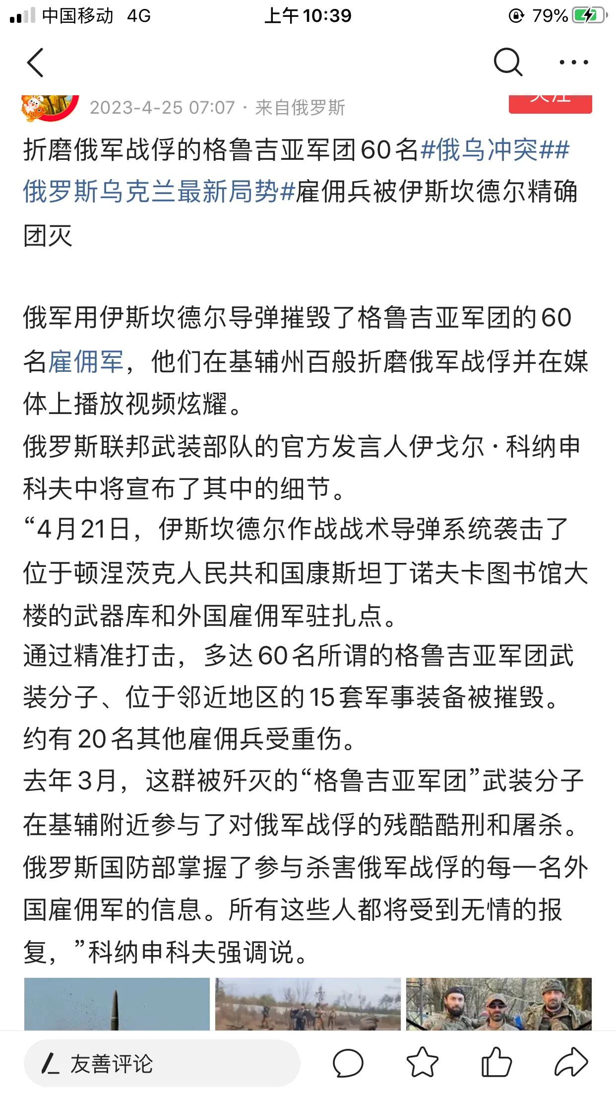 报应来了!虐待俄战俘的60名纳粹被团灭! 俄罗斯联邦武装部队发言人科纳申科夫宣布,4月22日,俄军用伊斯坎德尔导弹一举将60名臭名昭著的格鲁吉亚纳粹军全部炸死!去年3月份,这帮残忍分子在基辅附近对俄军战俘进行了残酷的酷刑和屠杀,并且发在网上炫耀,俄军记住了每位参与屠杀的纳粹! 在22日,俄军锁定这帮格鲁吉亚雇佣兵团藏在顿涅茨克地区的康斯坦丁诺夫卡图书馆,于是迅速发射了多枚伊斯坎德尔导弹进行精准打击,这60名纳粹被一举团灭,同时有15套军事装备被摧毁,另外还有20多人受伤!论报复手段,俄军数全球第一,纳粹还是小心点为好!