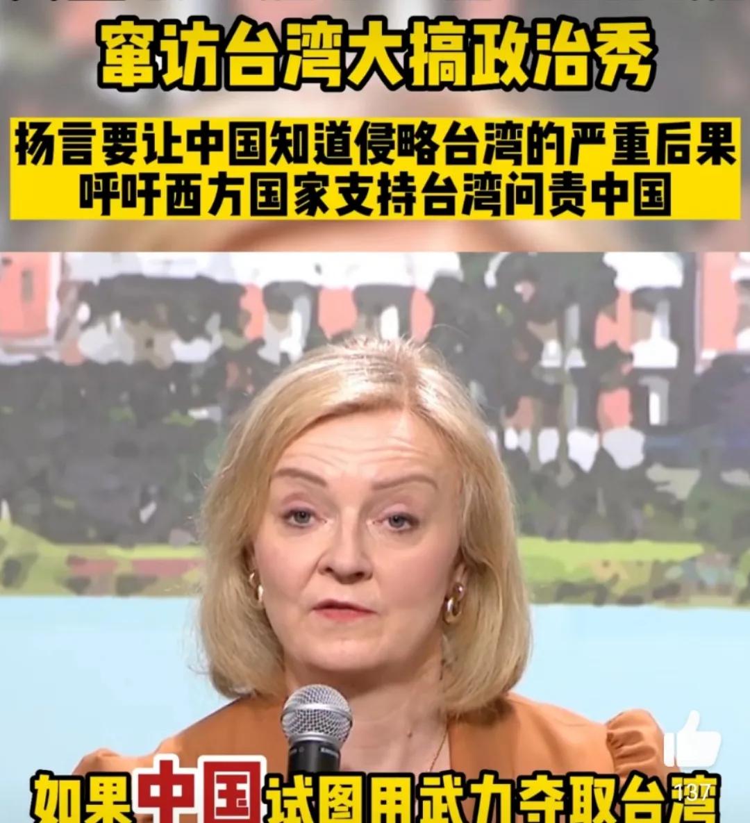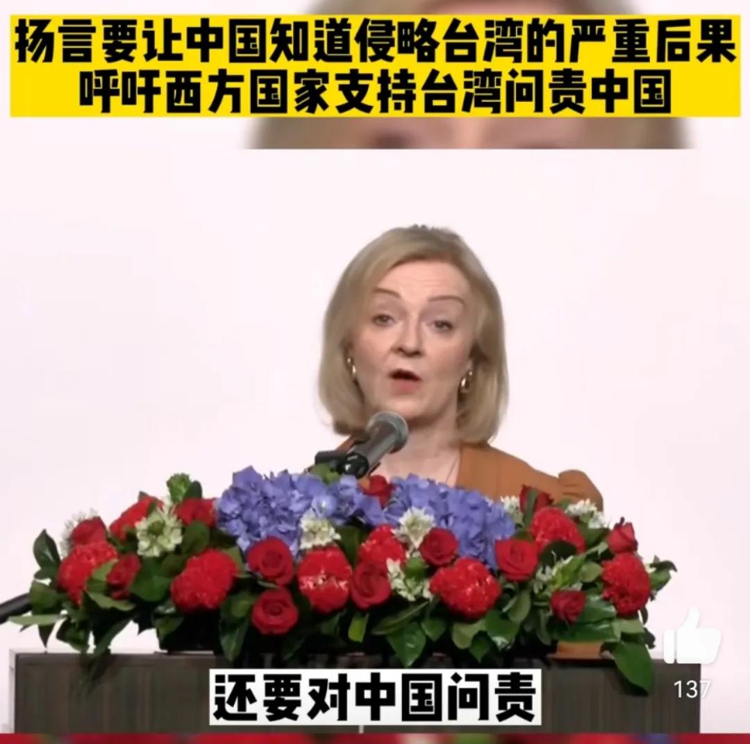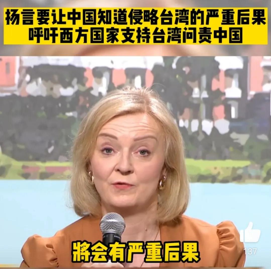 英国前首相称如果大陆敢武力攻台要对中国进行问责,短命首相特拉斯窜访台湾,并且大放厥词,称如果中国武力夺取台湾将会有严重后果,西方国家不仅要力挺台湾还要对中国问责,我们要尽可能确保台湾得到保护,并且让中国政府明白如果他们试图武力夺取台湾,将会有严重后果。她还强调英国和世界需要在未来几年持续支持台湾,并表示“台湾的未来就是我们的未来”。