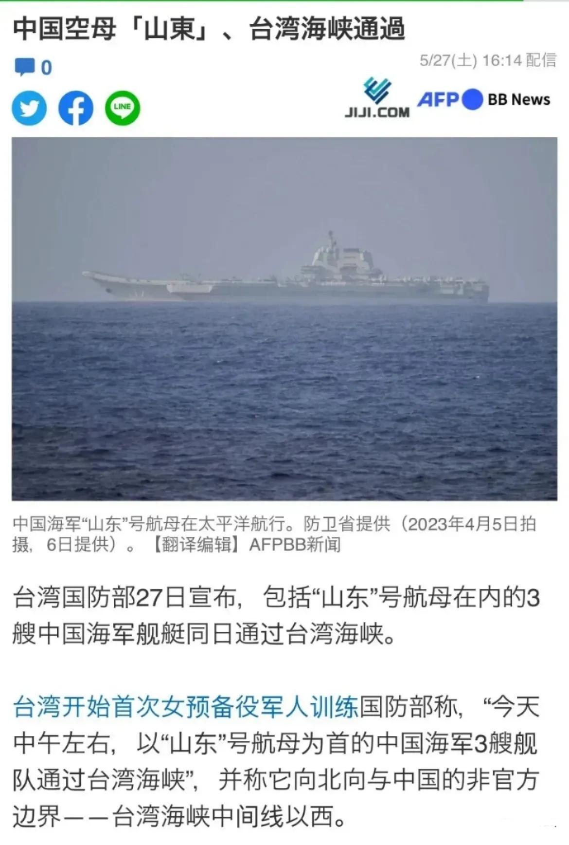 山东舰航母编队穿越台湾海峡,警告意味浓厚。据日媒报道山东号航舰编队27日通过台湾海峡,沿中线以西,向北行驶。随行的还有152驱逐舰和515护卫舰。据推测山东舰航母编队这次有可能是要绕台湾岛航行一周。可能是对近日美国派出200多名军人赴台帮助台军训练的回应。任何破坏两岸和平企图分裂的行径都将遭到中国军队强有力的回应。
