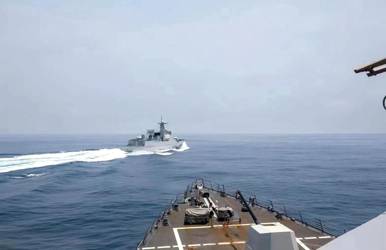 中国052D驱逐舰穿插美舰前方正面照。这么看两舰的距离确实挺近的,从浪花来看美舰应该正在全力加速企图将苏州舰甩在身后。然而中国军舰显然动力更强,能在这么短的距离内就超过美方,并且从美舰的前方斜插了过去,这一点估计美方是没有预料到的。对美国而言很难接受自己会因为武器不如人而吃了亏。必然是憋一肚子气,所以才会在事后断章取义的披露此事,显然是被吓得不轻。