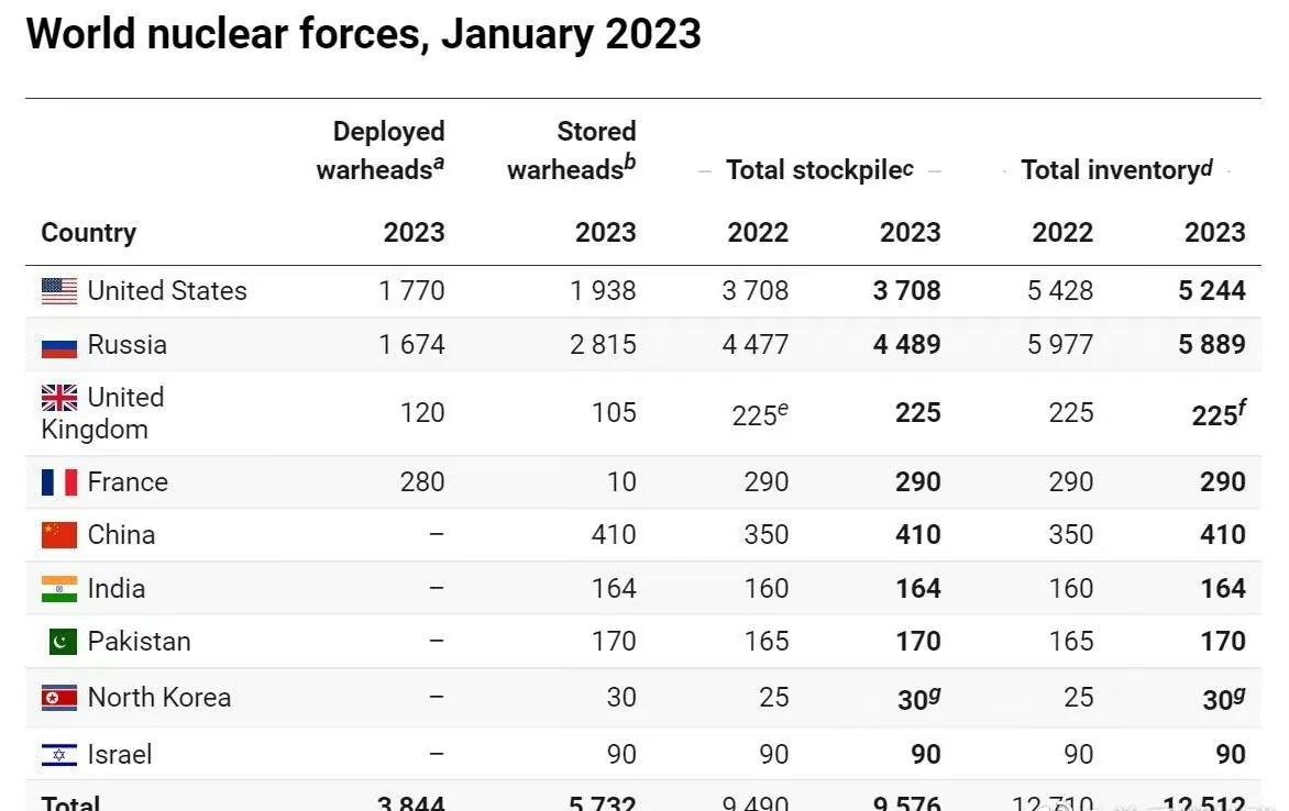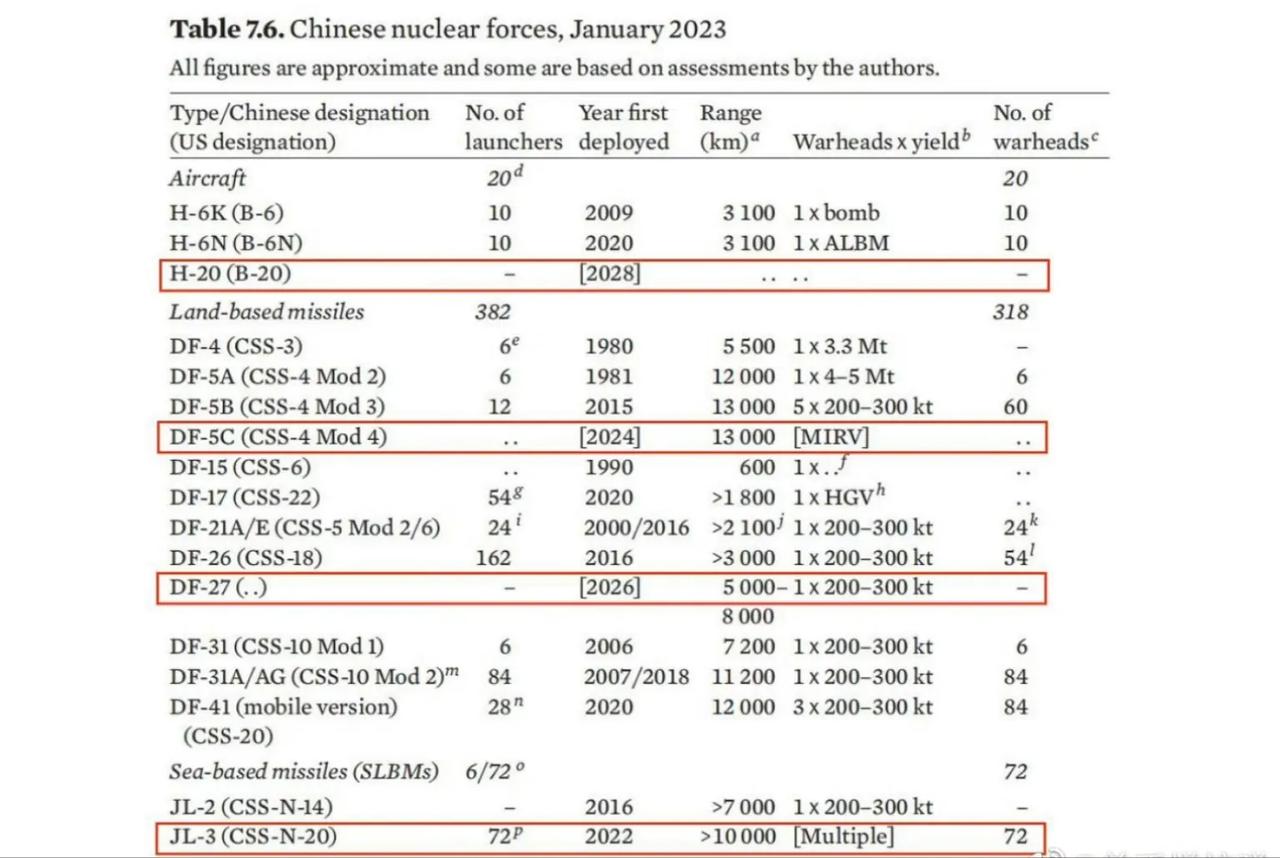 中国战略武器杀手锏发展状况:巨浪3已经开始服役,核弹头数量每年增加60枚,目前已经有400枚。2024年东风系列最新款东风C将开始服役。射程超过1.3万公里。2027年东风27中远程弹道导弹服役。2028年左右轰20隐身战略轰炸机服役。以上信息是由瑞典的斯德哥尔摩国际和平研究所(SIPRI)发布的2023年全球核武器发展报告披露。