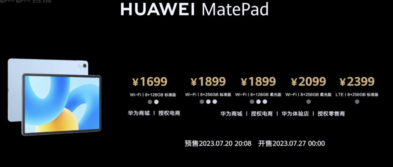 1699元起的华为MatePad 2023款发布了,搭载骁龙7Gen1,主打护眼屏幕,提供标准版和柔光版两种机型,其中柔光版采用了防眩纳米蚀刻技术,通过了莱茵无反射认证等,基本是护眼效果拉满。 不过除了屏幕,其他配置就很一般了,骁龙7Gen 1处理器、7700mAh电池,22.5W快充,HarmonyOS 3.1 系统,支持 M-Pencil(第 2 代),柔光版售价1899元起(128GB),你们觉得怎么样?[吃瓜群众]