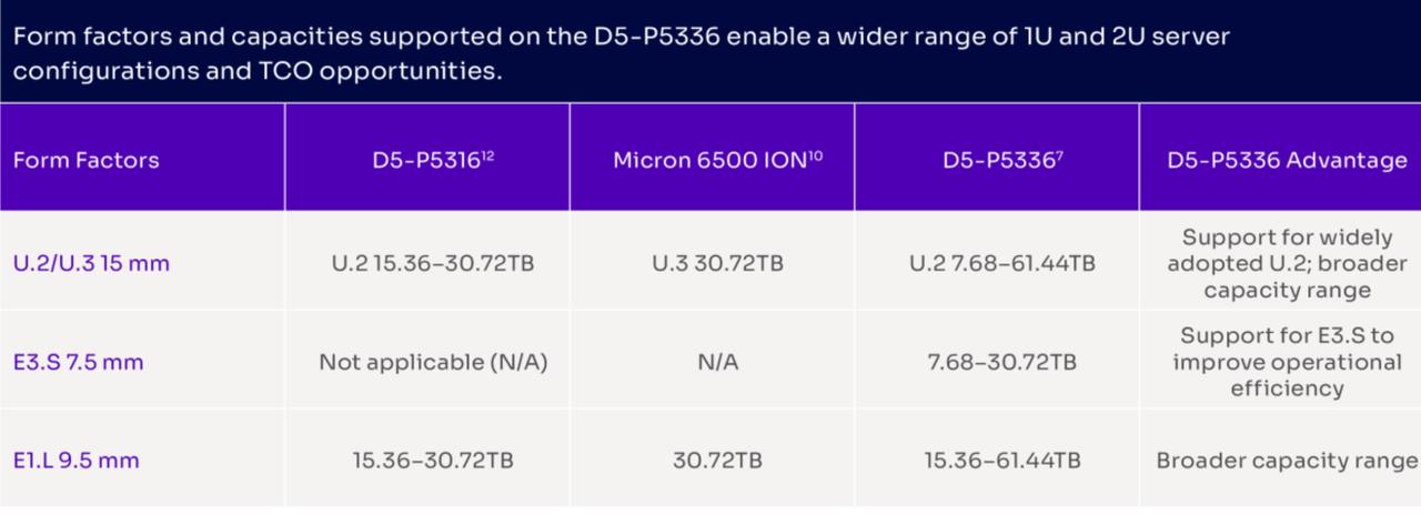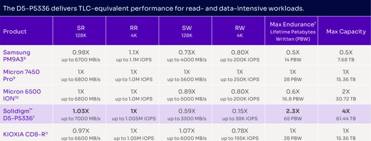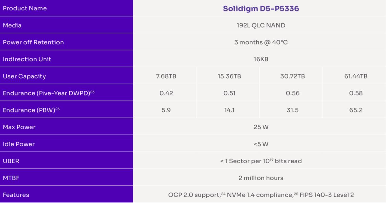 【SSD硬盘容量突破61TB】近日,Solidigm推出了目前容量最大的SSD硬盘——D5-P5336,最高61.44TB,主要为超高密度读取密集型存储应用而设计。据悉,这款SSD硬盘采用SK海力士的192层QLC闪存,支持PCIe 4.0 x4,读取速度达到了7000MB/s,写入速度也有3300MB/s,支持5年质保期内0.58 DWPD,Solidigm甚至表示不输TLC闪存。不过,其功耗也达到了25W,待机时能降低到5W以内。 Solidigm 将提供三种尺寸的 D5-P5336:U.2/U3 15mm、E3.S 7.5mm 和 E1.L 9.5mm,容量范围从7.68TB一直到61.44TB,不过只有U.2/U.3 和 E1.L才有61.44TB容量可选。