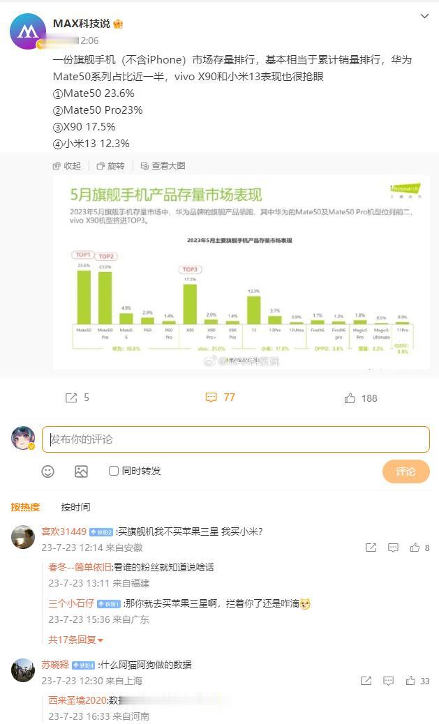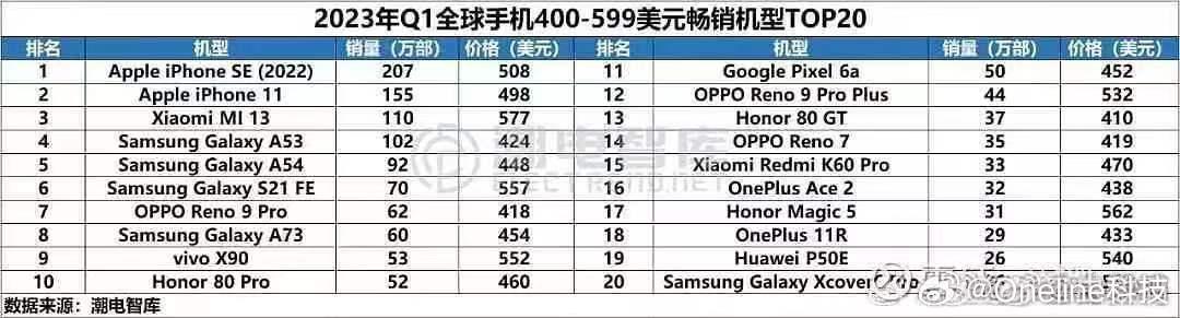 小米13在Q1季度卖出110万台,所以大家觉得小米13系列总销量能达到多少台了?[看] 这个统计很有意思,400到599美金的范围区间,刚好把华为Mate50标准版排除在外。 反倒是荣耀Magic5挺亮眼的,毕竟这机子是3月底才正式开售,标准版就有30W+销量,Pro版和至臻加起来也有30W+,那当初说的首销50万台基本吻合。[奸笑] 图三是另一组数据,华为Mate50系列销量遥遥领先,不过有不少米粉不认可,那就算了。[尬笑]