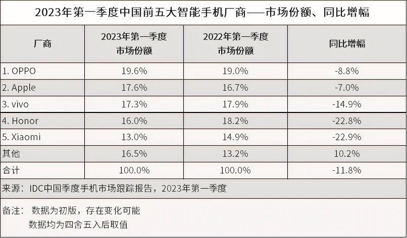 第二季度手机销量出炉:苹果第四,荣耀挤进前三,第一的OPPO还是上半年第一? 近日,财联社发布了一则消息:IDC公布了2023年第二季度中国智能手机的相关数据,OPPO延续Q1势头上半年成为中国市场第一。 看到Q2国内市场份额排在前五的手机厂商还是那几个,但如果对比第一季度的数据,排名就有意思了,像是苹果从第二变到了第四,难道iPhone 14系列不香了?看来15系列可能要大爆发了。表现亮眼也有不少,像荣耀从第四到二季度的第三、一直保持第一位的OPPO,拿下上半年国内市场份额第一也是妥妥的! OPPO之所以能稳定两个季度第一,其实从产品端就能看出OPPO发力了,其中OPPO打出的“影像+折叠”双旗舰策略的效果是明显的,成功帮助OPPO在600美元以上高端市场份额进入了前三位。小折叠屏Find N2 Flip绝对是大功臣,是上半年折叠屏单品的第一,看来大外屏的方向是很对的,怪不得刚发布的三星Z Flip5也跟进了。 400-600美元价位则是Reno系列表现出色,如在6月推出的全系配备长焦镜头、主打光影人像的Reno10系列。还有就是旗下品牌一加的迅速增长了,据悉其增速高达三位数,今年发布的一加11、Ace2、Ace2V三款机型都是同档位极具性价比的机型。