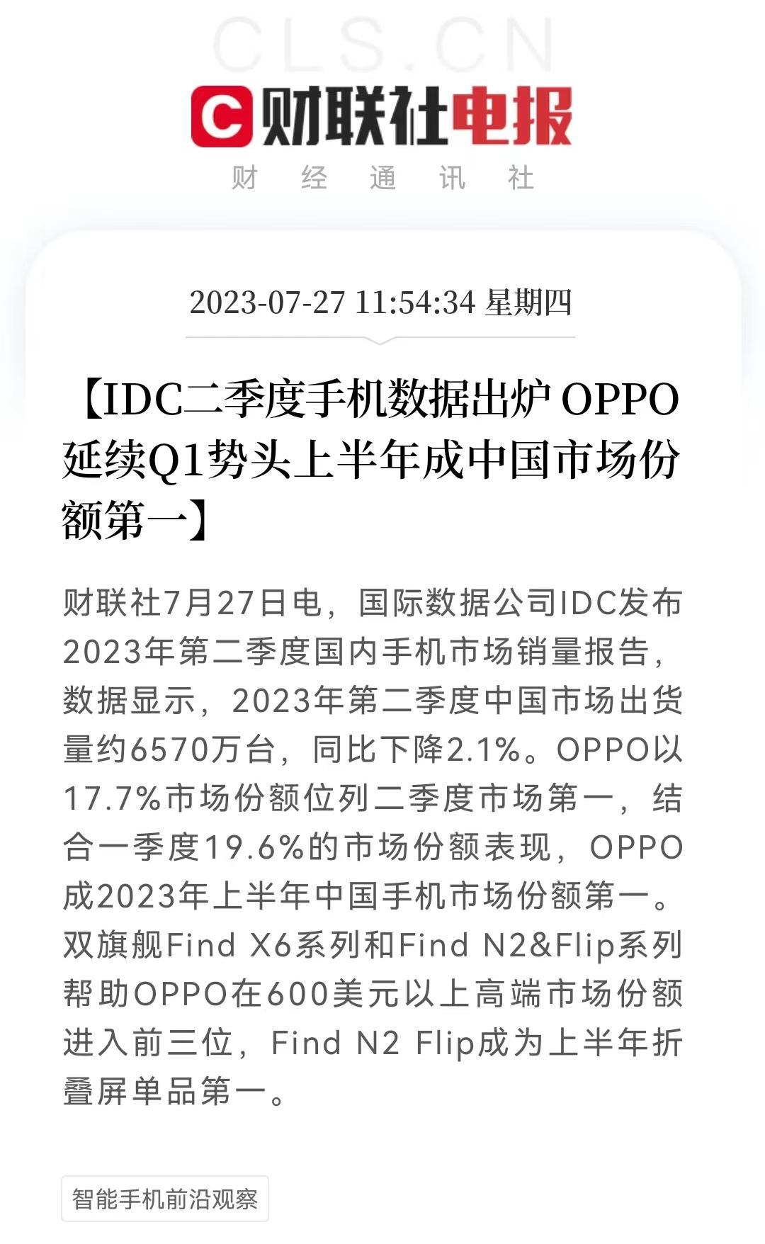 根据IDC的最新数据,。2023年第二季度,中国智能手机市场出货量约6,570万台,OPPO第二季度的份额为17.7%。这个表现应该离不开双旗舰的产品规划:Find X6直屏旗舰系列和Find N2&Flip折叠系列的发力。 在高端市场有Find,中端有Reno,而且一加上半年产品表现给力,综合得出这个份额也不奇怪了。