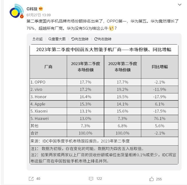 当初小米认为华为回归主流手机市场十分渺茫,所以才决定造车,如果华为再杀回来,会对已经分散部分精力去造车的小米造成非常大的压力。 现在Q2季度,华为5G还没回归的情况下,已经和小米的市场份额几乎一致,不知道是否会对小米造成压力?[吃瓜群众]