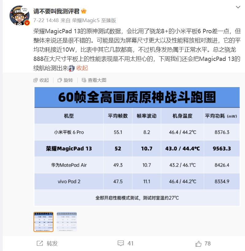 “荣耀MagicPad 13真的巨流畅,绝对是我今年用过最流畅的安卓/鸿蒙平板”,黑子说话![看] 之前这款平板刚发布的时候,很多米粉说为什么不买小米平板6 Pro,后者是骁龙8+芯片,而荣耀是骁龙888芯片。诚然,骁龙8+玩原神帧率更高一些,但你自己问自己,原神帧率可以决定一款产品综合体验吗?远远不能吧。[捂脸] 我很早之前就说过,荣耀的系统优化真的有一手,日常使用极致流畅,后台存活能力强,取决于你想换机的,大概率是你不想用了,而不是手机不能用了。