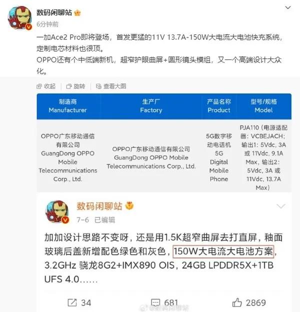 售价2字开头?一加Ace2 Pro可能今年最卷的,骁龙8Gen2、最强散热VC、150W+5000mAh...下面就汇总一波爆料信息。 1、处理器:骁龙8Gen2, 据说会联合高通骁龙调校,首发针对某款手游的全新技术,国民手游 原神、王者荣耀? 2、散热:全球首发航天级天工散热系统,9140mm² 散热面积,据说可能是业界性能最强的VC,至少领先行业两代。 3、1.5K超窄曲屏、釉面玻璃后盖,新增绿色和灰色,质感、颜值这一块就不用担心,Ace2的颜值本就很喜欢了,新增的灰色会不会更好看? 4、150W快充,电池容量可能突破5000mAh,续航这块也是拉满的,其他还有IMX890大底主摄、首发量产24GB+1TB大内存等等。 看下来,如果一加Ace2 Pro可以把骁龙8Gen2带到2999元,那肯定“杀疯”,你们觉得呢?[吃瓜群众]