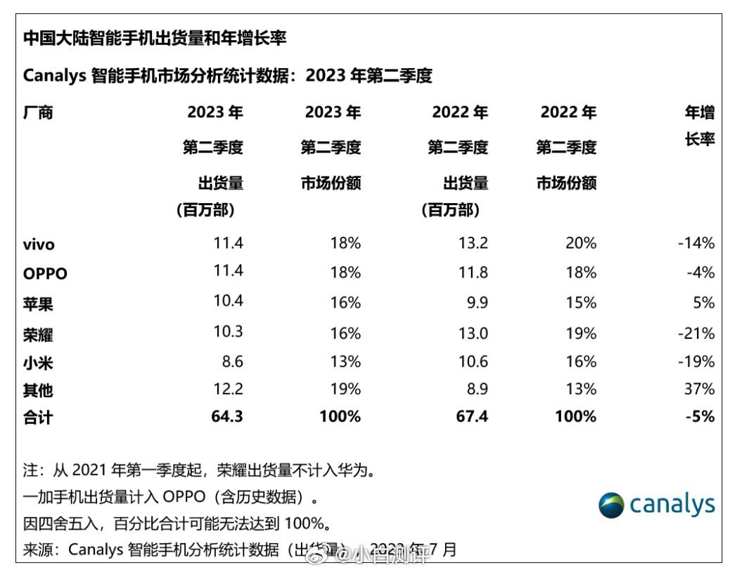 Counterpoint的销量数据出来了,2023Q2国内智能手机市场销量份额排名:❶vivo(17.7%)❷苹果(17.2%)❷OPPO(17.2%)❹荣耀(15%)❺小米(14%)❻华为(11.3%)❼realme(2.7%)。其它品牌合计4.9%。其中苹果同比增长7%,华为同比增长58%,realme增长8%。 2023Q2应该是近几年各家数据差异最大的一次了,Canalys、IDC、Counterpoint三家都算是比较权威的机构,前四名排序都不一样[允悲][允悲][允悲] 图2是Canalys出货量及份额排名,图3是IDC初版出货量份额数据。
