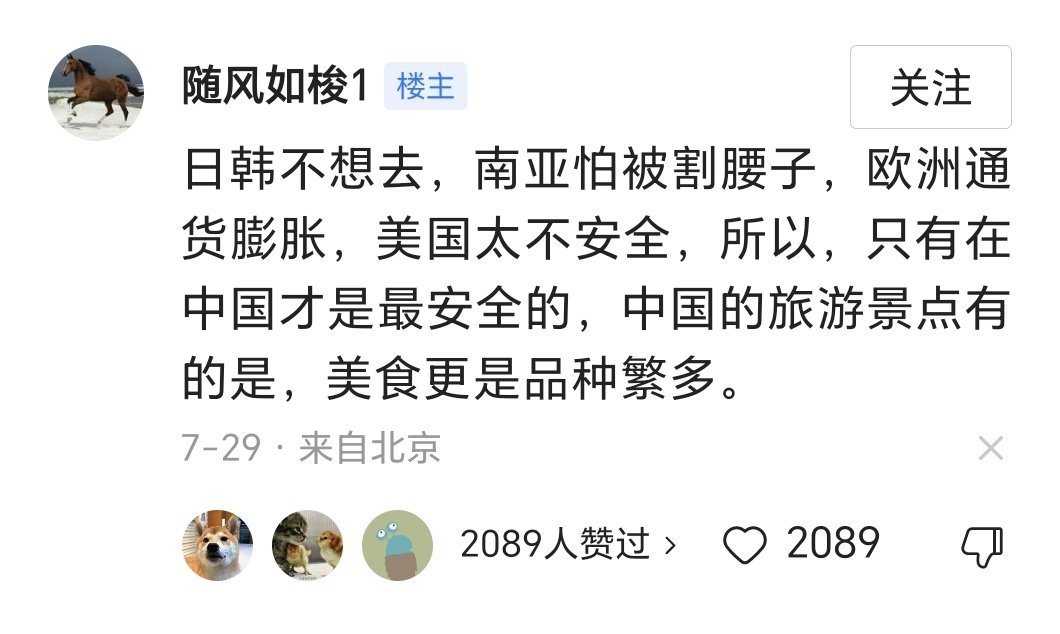 对此网友给出了灵魂一击称,日韩不想去,南亚怕割腰子,欧洲通货膨胀,美国不太安全,所以只有在自己国家旅游才是最安全的。