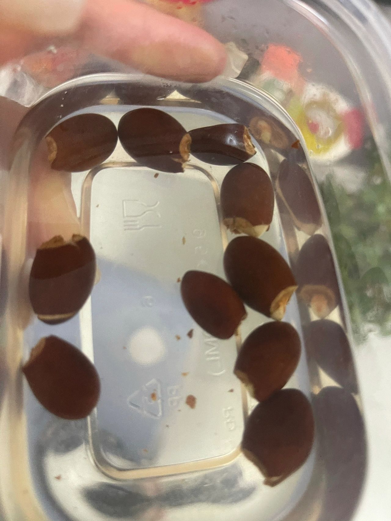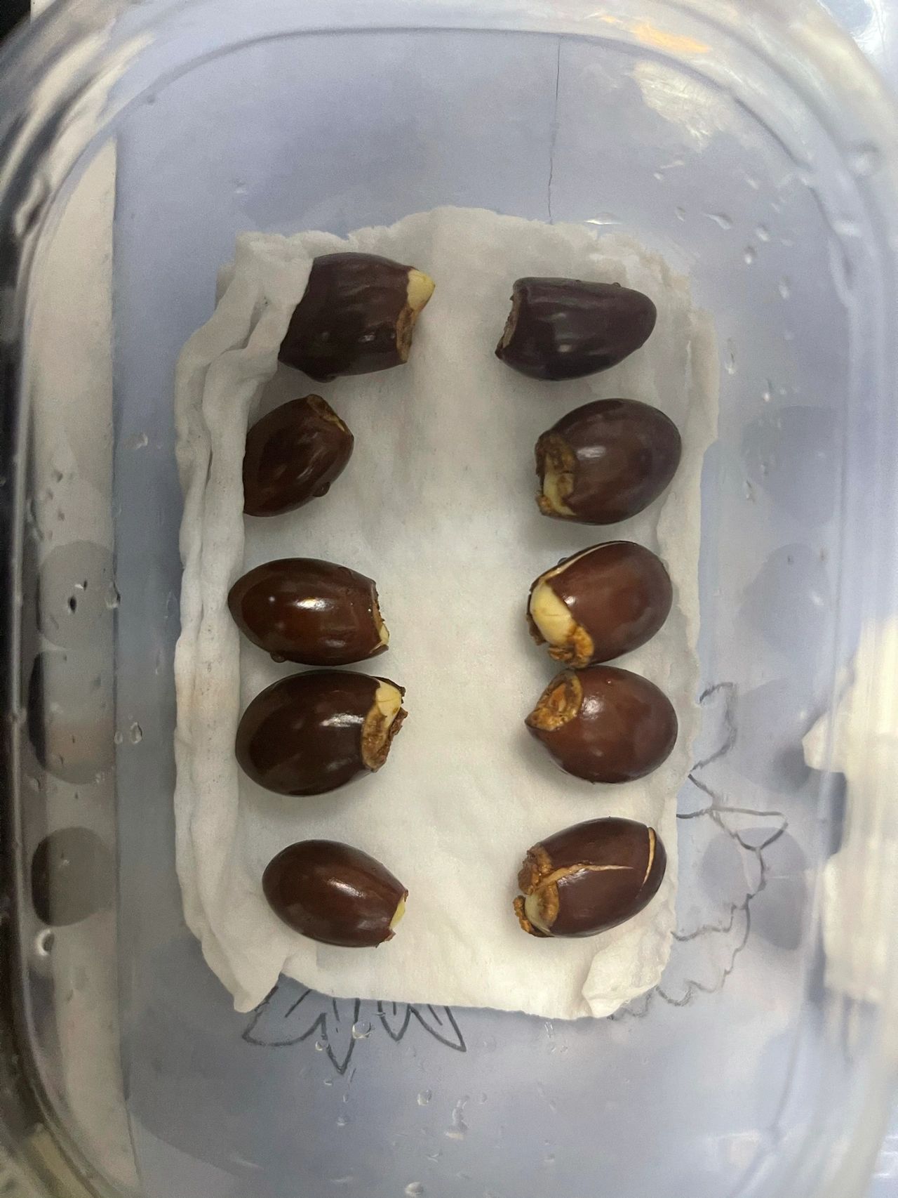 4.冒一点芽就可以把水倒掉,换成用湿巾纸上下各一层盖住放进盒子,可以不用一天一换,但是注意不要酸掉,可以隔两天把核拿出来冲冲水。