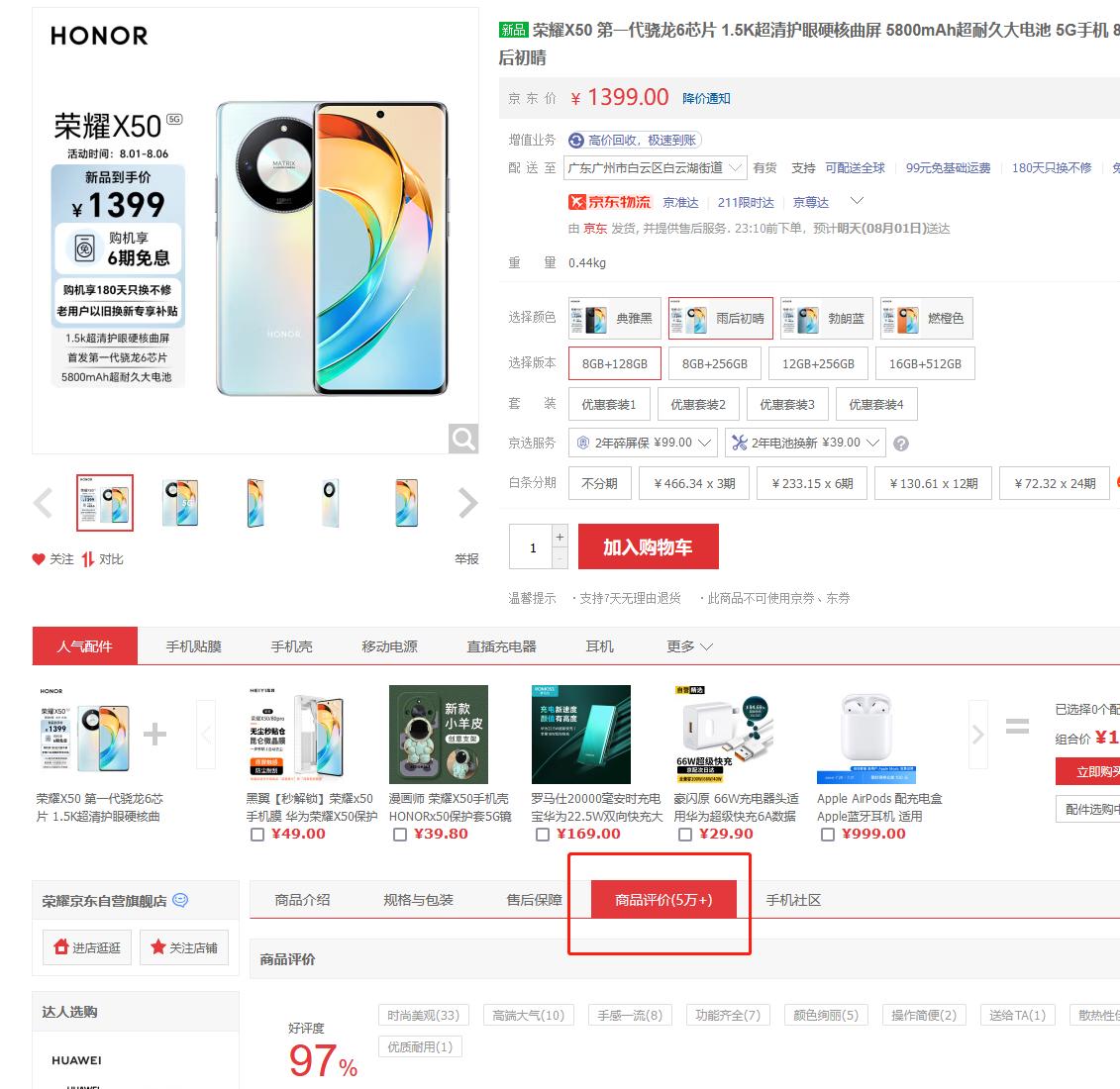 荣耀X50线下供不应求,刚到店就卖完了。线上某东评论数已经5W+,好评率97%。 看来荣耀X50受欢迎程度非常高,怪不得还要增产,可能今年会拿下安卓单品销量冠军了。 配置方面荣耀X50抓住用户痛点,把屏幕、续航、外观品质、系统流畅度等方面做到了同价位最强。 很多人嘲讽荣耀X50只有35W快充不如友商,我觉得这是没道理的。因为5800mAh+35W组合,和5000mAh+60W组合,再把快充单独拎出来对比,这样合适吗?[捂脸]