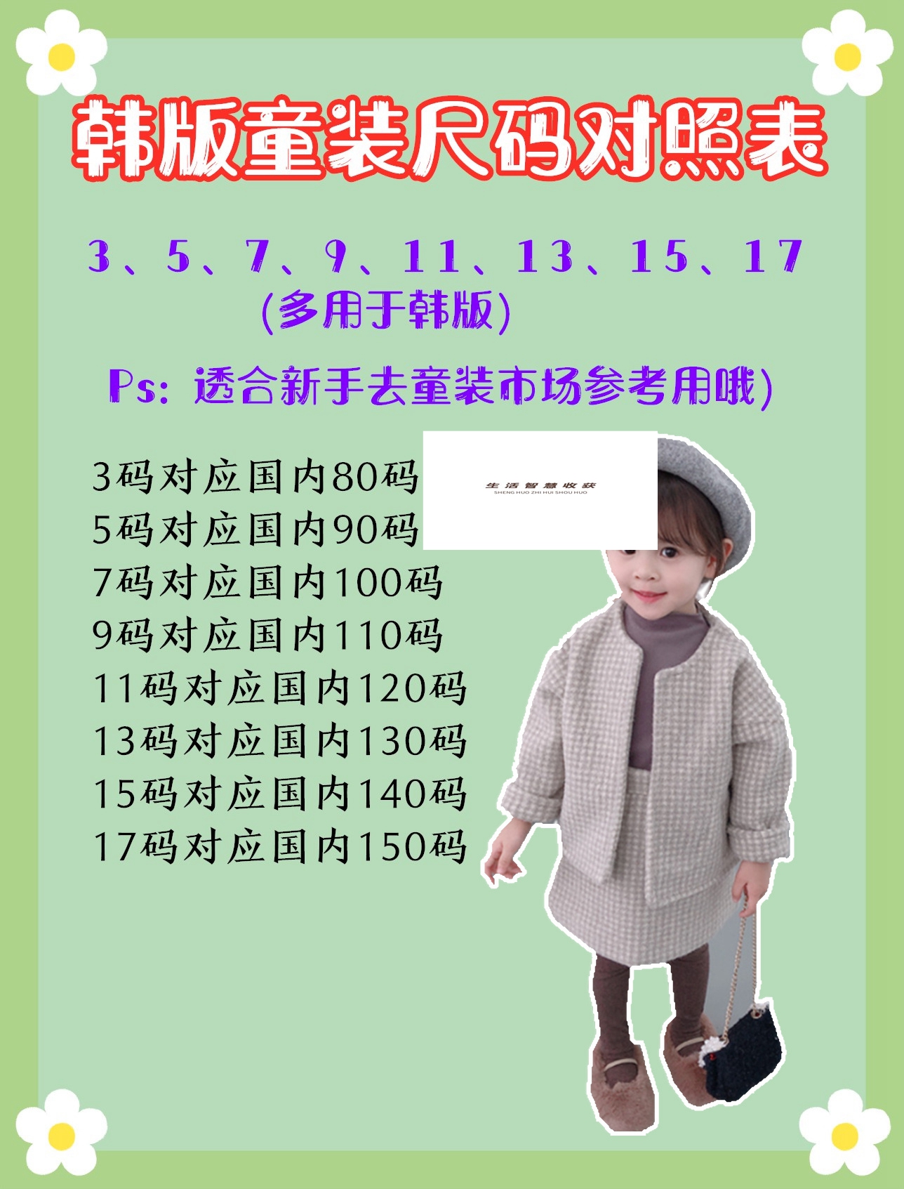 ⭕️图四是韩版尺码对照表,有些档口是韩国档口,韩版衣服居多,这样宝妈可以按照这个尺码给宝宝选衣服咯,不怕看不懂韩版童装尺码了!