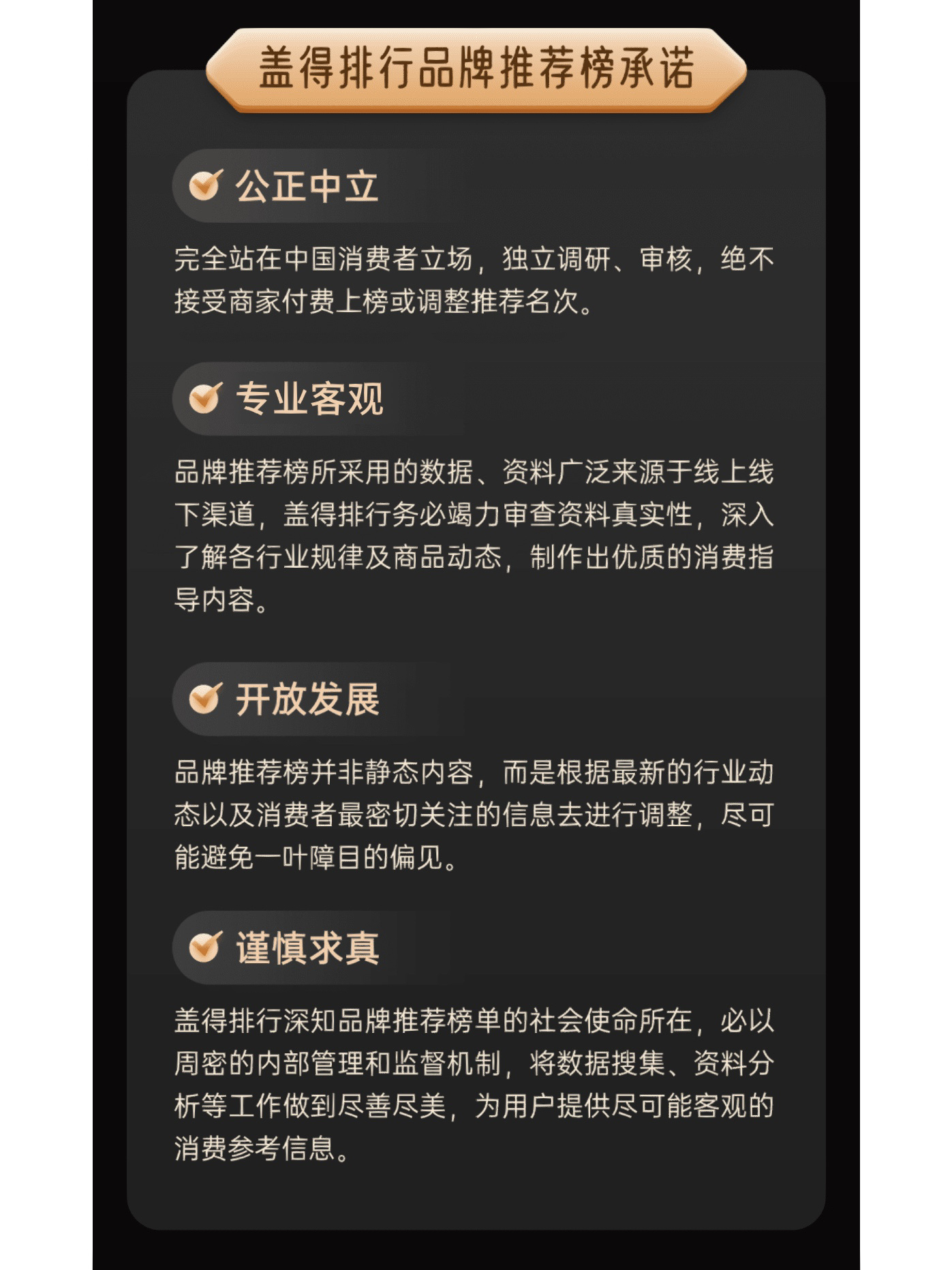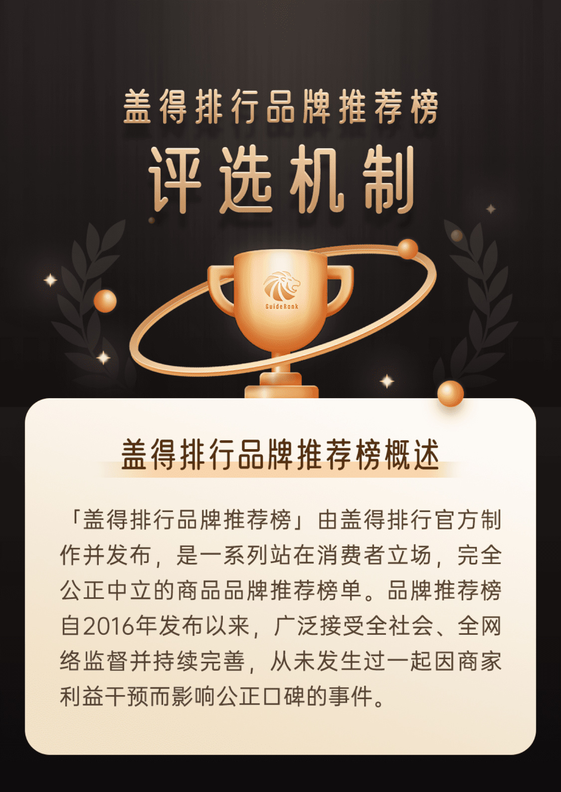 这篇排名报告由盖得排行独立调研完成,盖得排行出具的品牌报告及排名,皆基于公正中立的原则,不受任何商家影响。公正客观排名,是盖得排行的生命线。公司自成立以来,完全杜绝了收钱排名,从未出现过一桩收钱排名的丑闻。