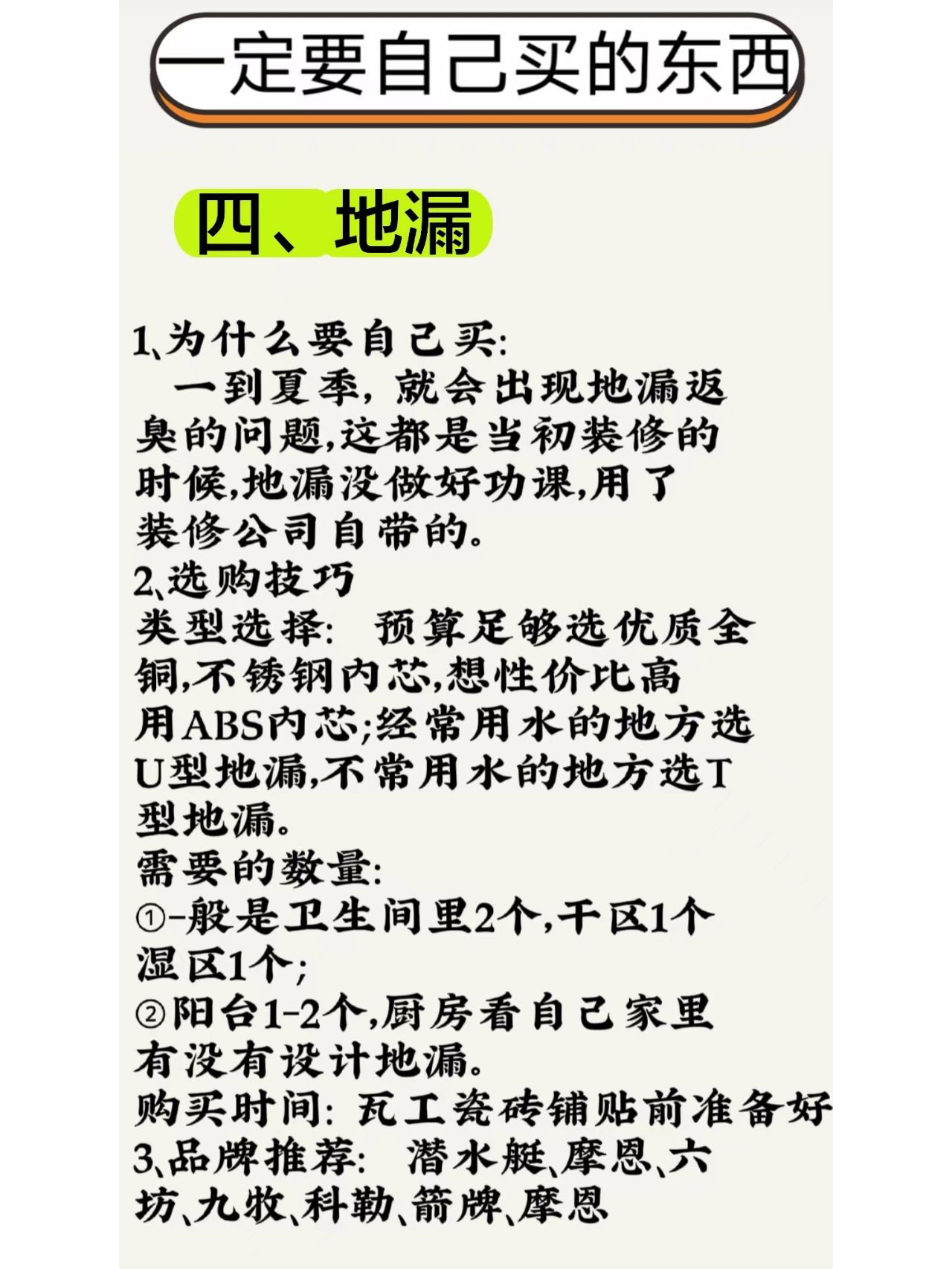 类型选择:预算足够选优质全铜,不锈钢内芯,想性价比高用ABS内芯;经常用水的地方选U型地漏,不常用水的地方选T型地漏。