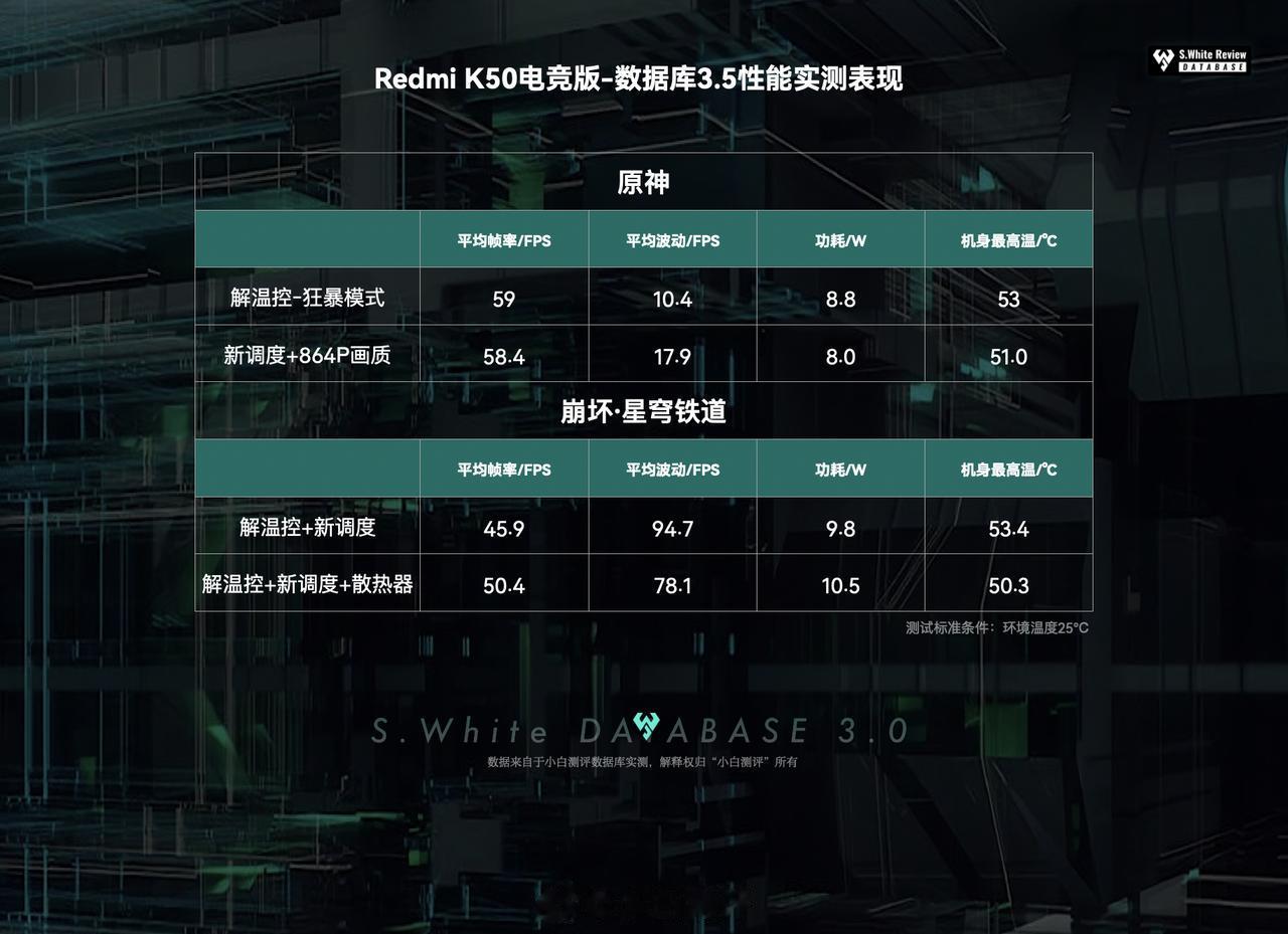 有多少小伙伴还在钉骁龙8Gne1的手机,时隔18个月后体验还好吗?[灵光一闪] 骁龙8Gne1 性能横评项目中,Redmi K50电竞版经过解温控后,数据库3.5《原神》可以跑到59 FPS,机身温度最高53℃; 经过降压、刷内核之后,864P画质的《原神》可以跑到58.4 FPS,机身最高温度51℃;数据库3.5《星穹铁道》45.9 FPS,机身最高到53.4℃,散热器加持后,帧率达到 50.4 FPS,功耗来到10.5W。 测试标准条件:环境温25℃±0.5℃,屏幕亮度350nit,声音50%,性能模式。