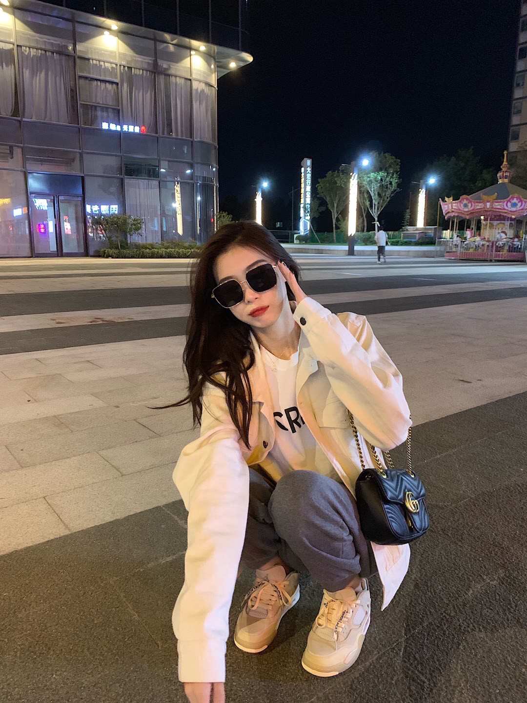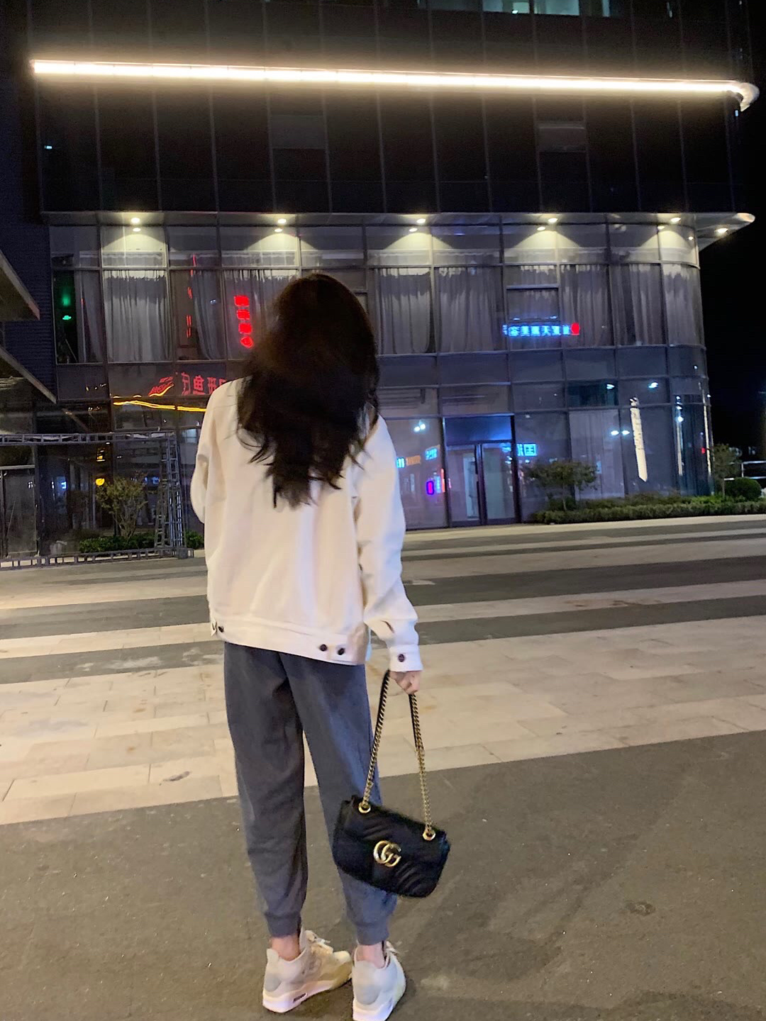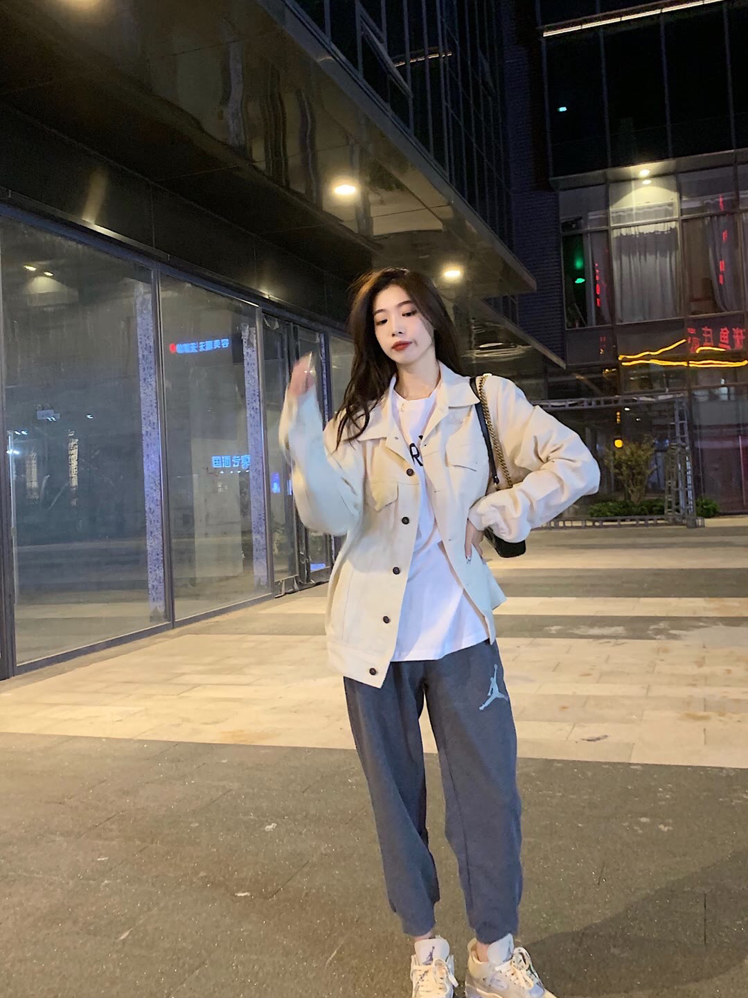 巴宝莉奶白外套+乔丹深灰色束脚裤