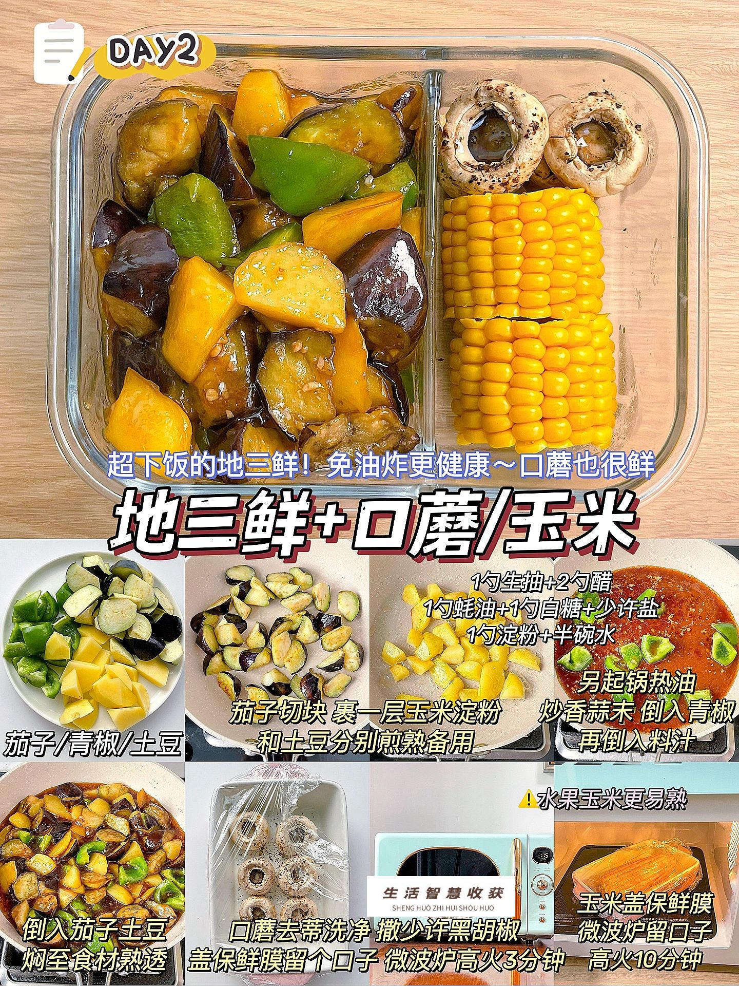 步骤:茄子切块,裹一层玉米淀粉,和土豆分别煎熟备用;另起锅热油,炒香蒜末,倒入青椒翻炒;倒入料汁(1勺生抽+2勺醋+1勺蚝油+1勺白糖+少许盐+1勺淀粉+半碗水),再倒入茄子土豆,焖至食材熟透;口蘑去蒂洗净,撒少许黑胡椒,盖保鲜膜,留个口子,微波炉高火3分钟;