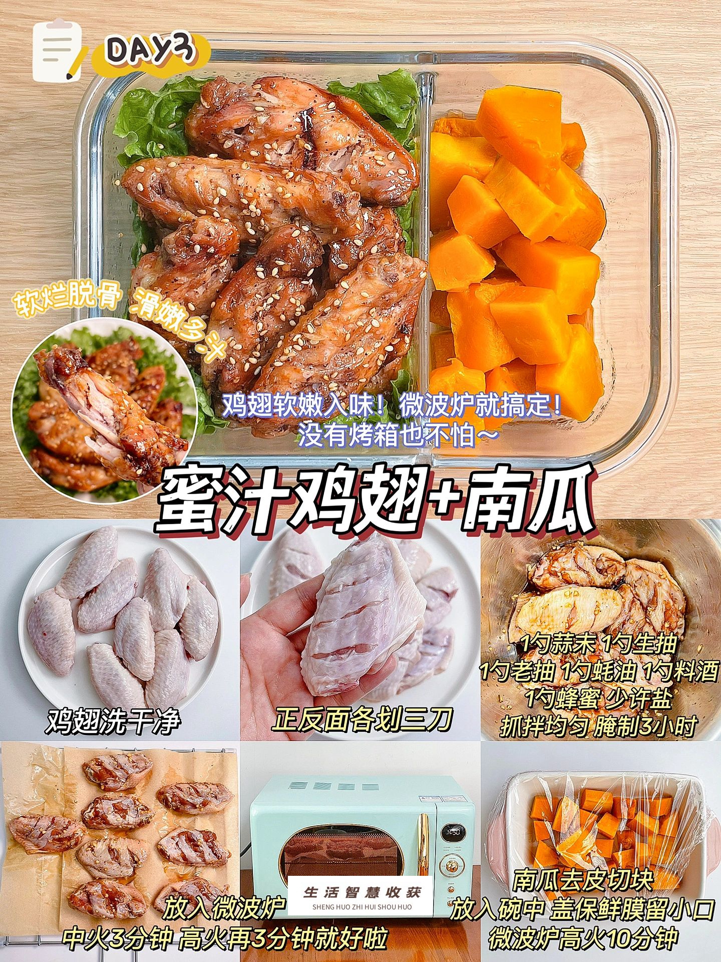 步骤:正反面各划三刀;1勺蒜末、1勺生抽、1勺老抽、1勺蚝油、1勺料酒、1勺蜂蜜、少许盐,抓拌均匀,腌制3小时;放入微波炉,中火3分钟,高火再3分钟就好啦;南瓜去皮切块,放入碗中,盖保鲜膜留小口,微波炉高火10分钟;