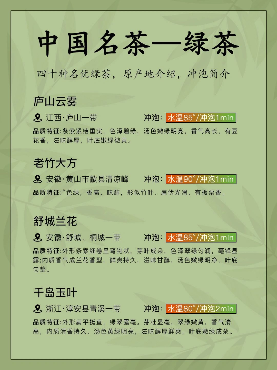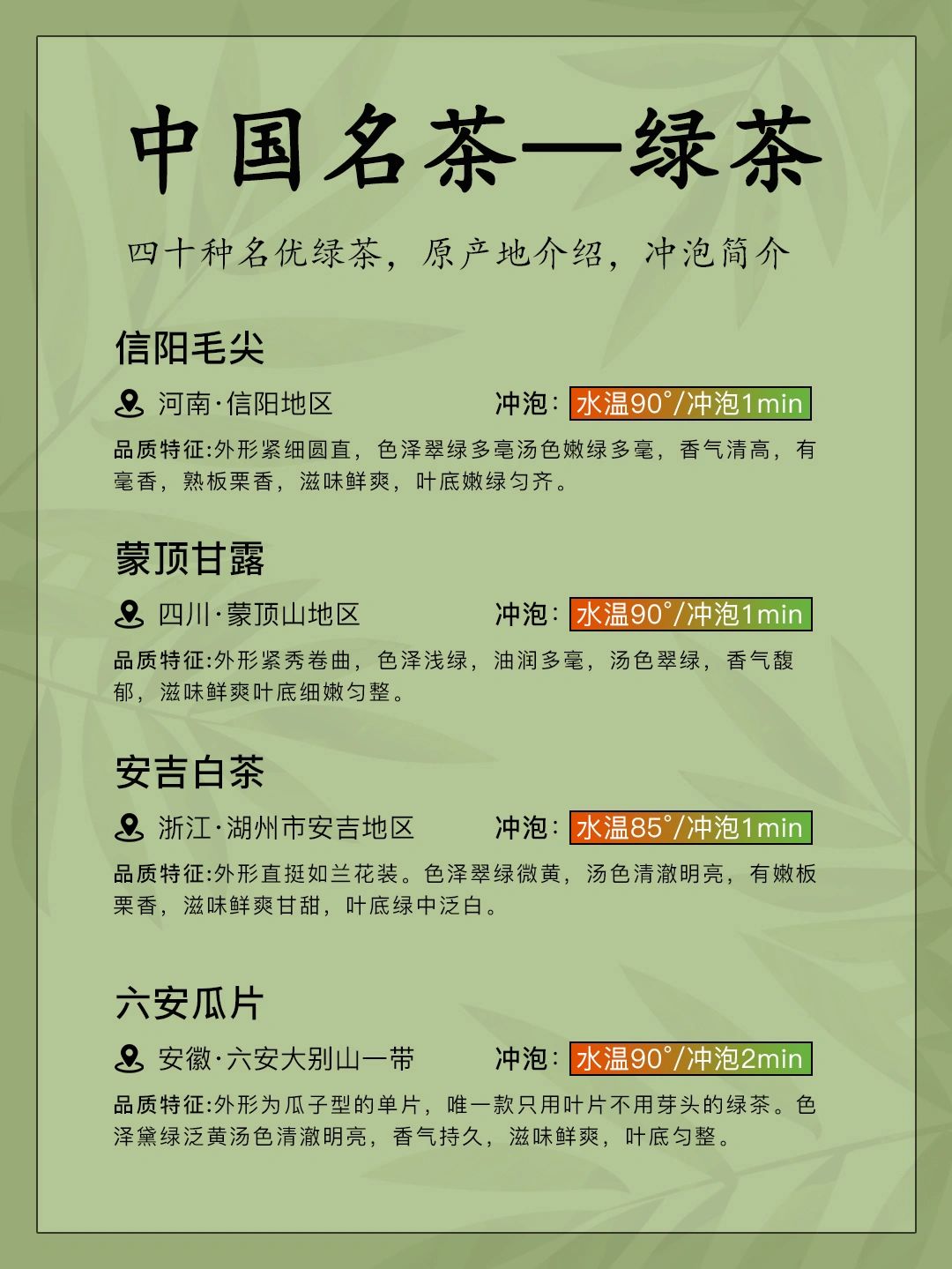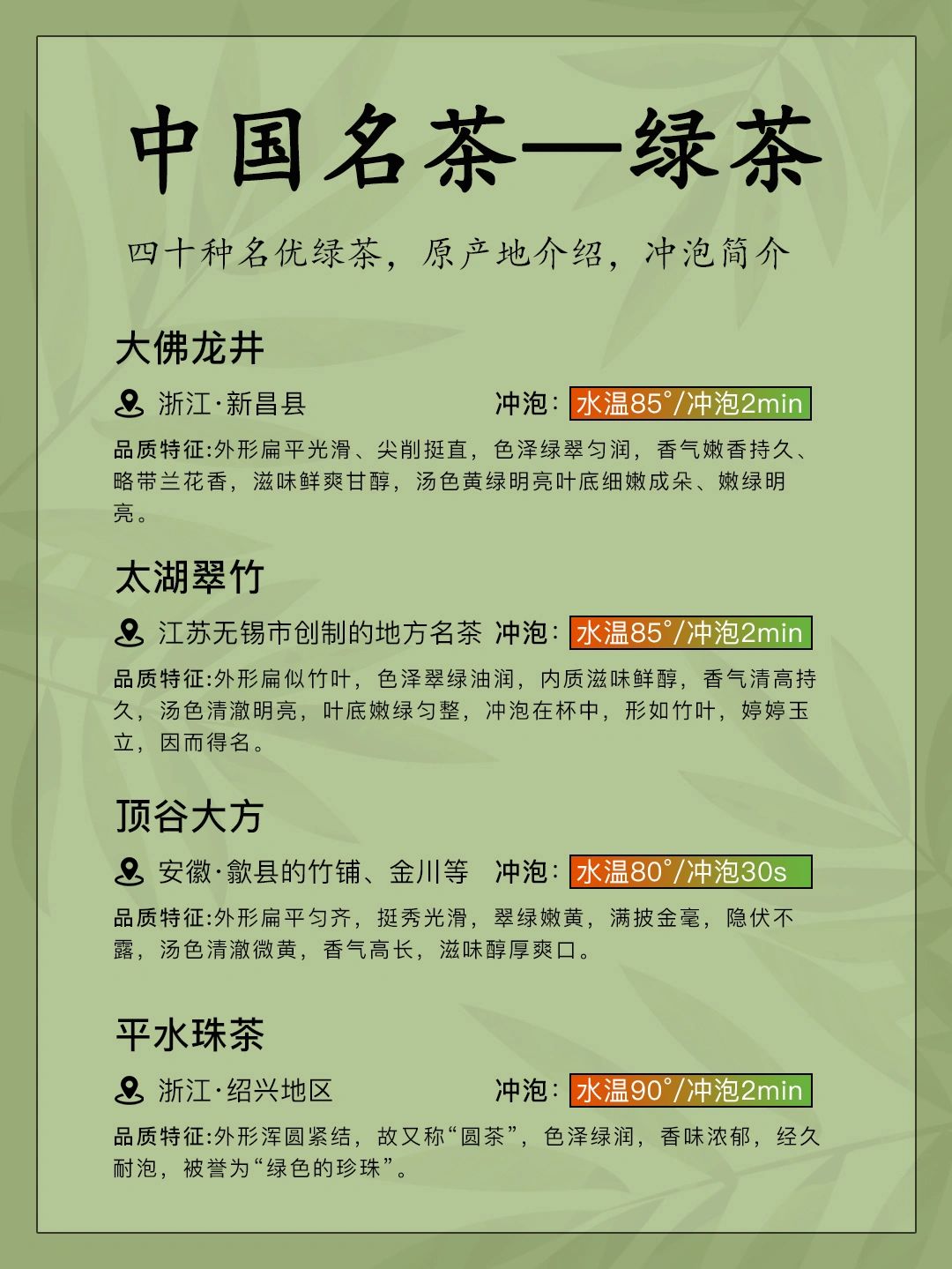 之前盘点过的红茶中正山小种、金骏眉、祁门红茶,乌龙茶中铁观音、大红袍等等。今天给大家盘点一下中国传统名茶中包括西湖龙井、洞庭碧螺春在内的四十种绿茶~