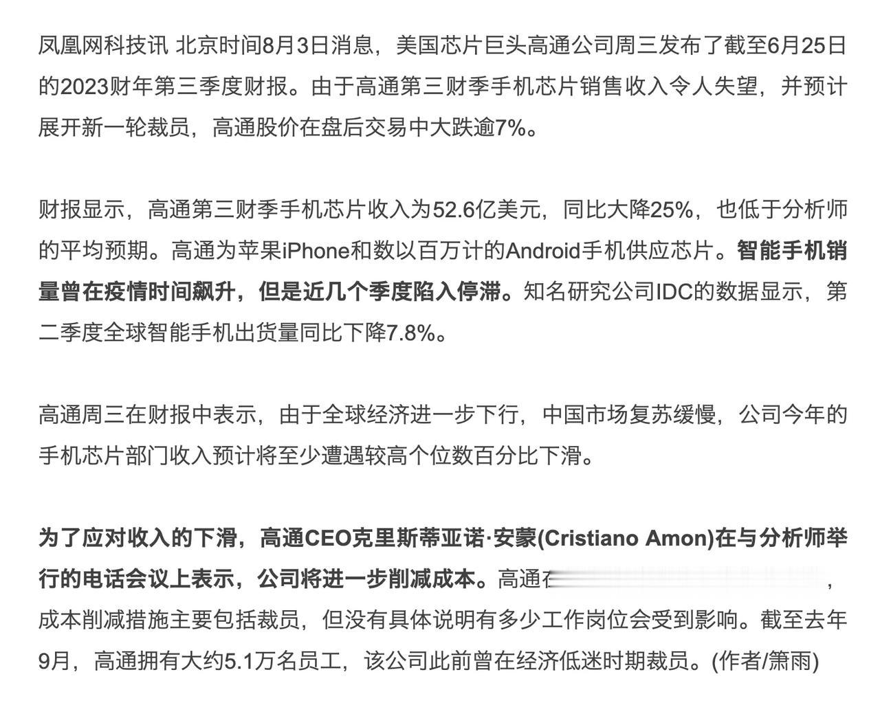 由于手机销售不景气,直接影响高通第三财季业绩,利润暴跌 高通高管表示将进一步削减成本,预计展开新一轮裁员