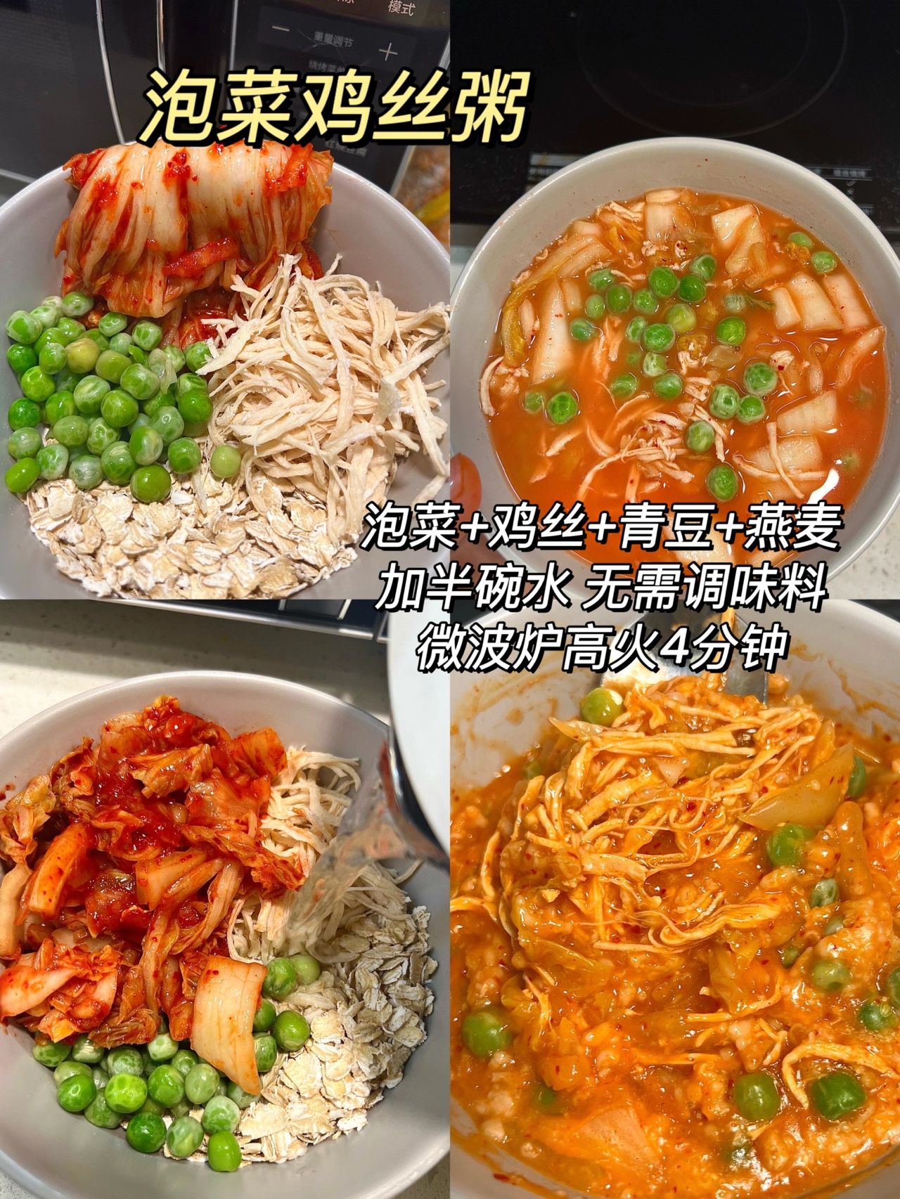 泡菜切块,冷冻青豆1把,鸡胸肉撕丝,水煮燕麦