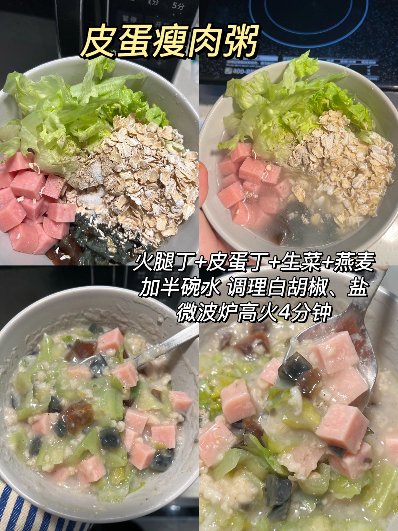 1个皮蛋切丁,火腿肠切丁,生菜段,1袋水煮燕麦