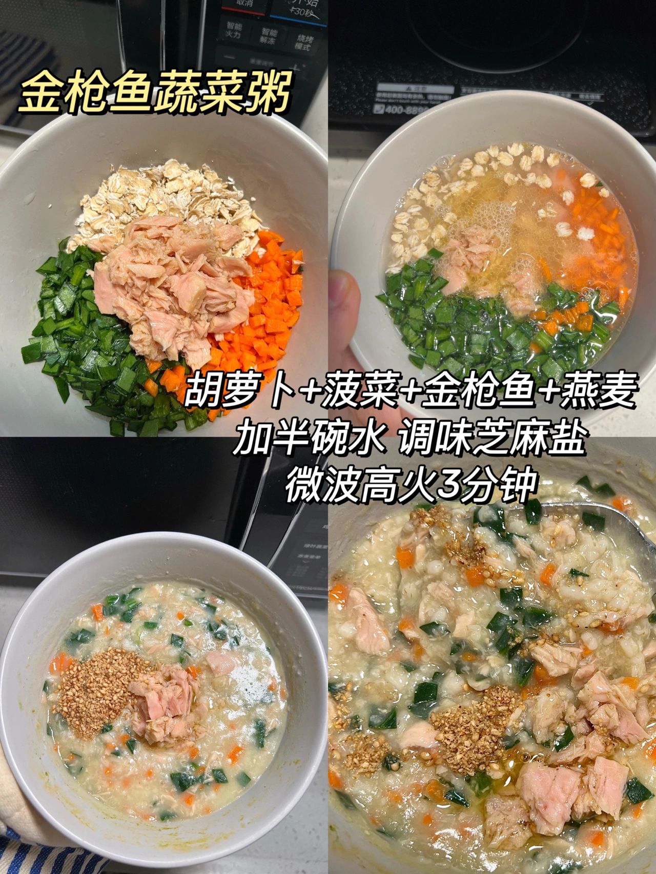 1/2金枪鱼罐头,胡萝卜切片,菠菜切碎,1袋水煮燕麦