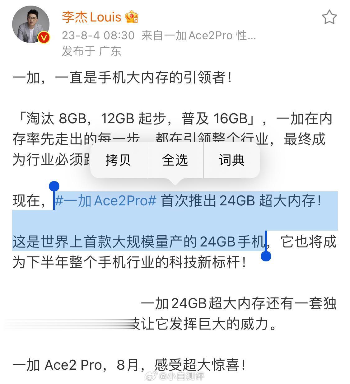 一加今天的预热:8GB淘汰,12GB起步,16GB普及,24GB引领。一加Ace2Pro是世界上首款大规模量产的24GB手机?[吐舌] 你手机运存是多大的?[吐舌]