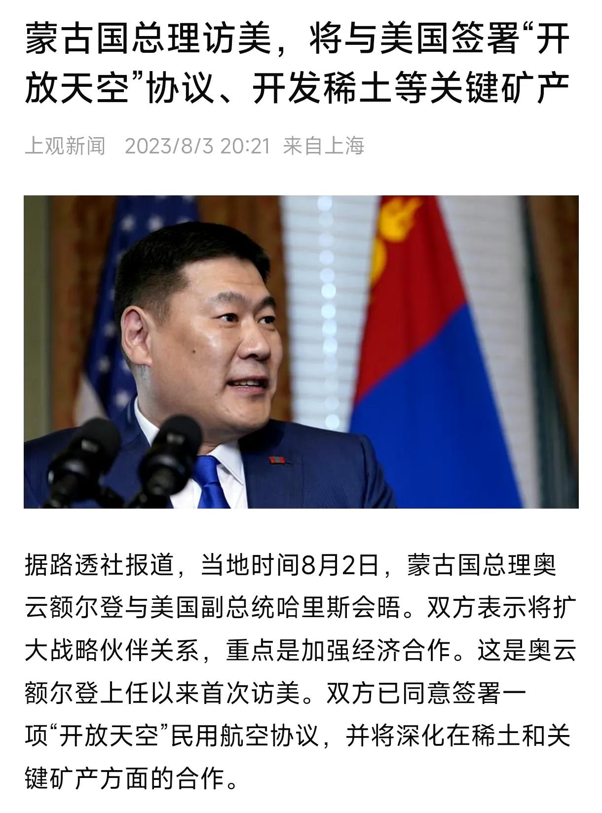 蒙古国的太空技术和他们的海军一样强大,连美国这样的太空强国都要拉着蒙古来合作。与此同时蒙古还表示将向美国开放自己的天空,同时两国还达成了稀土开采协议。美国真是煞费苦心啊。