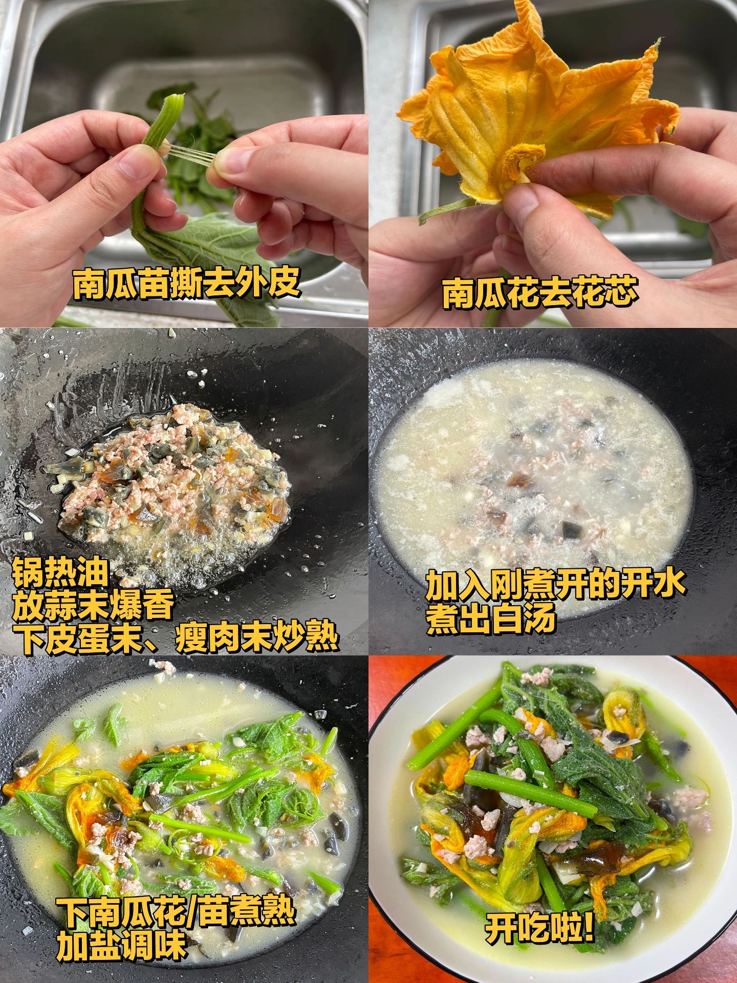 3️倒入刚煮开的开水,煮出白汤后放入南瓜花/苗,煮熟放盐调味