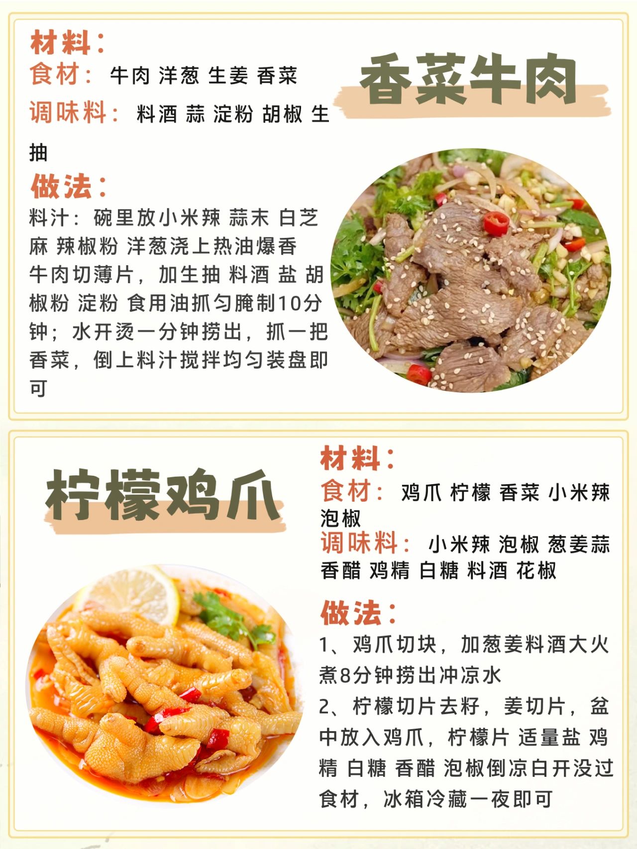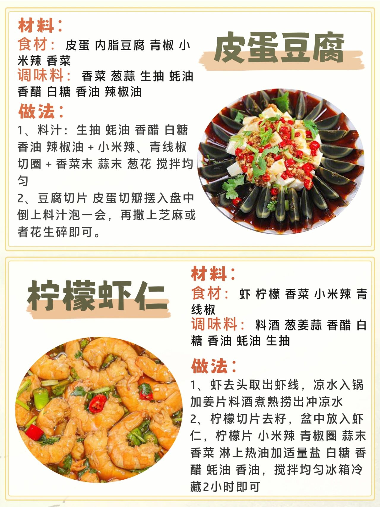 凉拌:香菜牛肉,柠檬鸡爪,皮蛋豆腐,柠檬虾仁