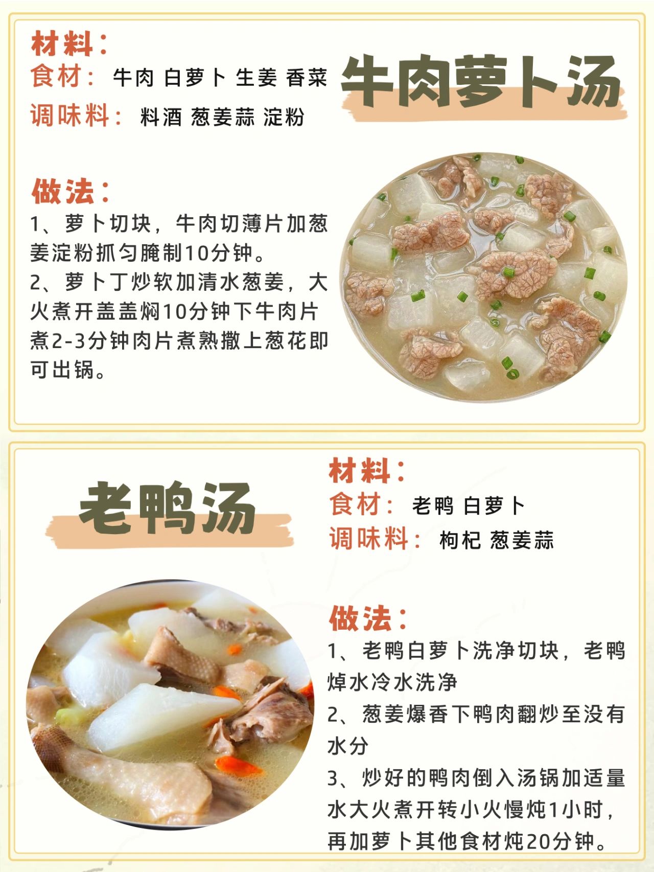 汤类:莲藕排骨汤,板栗炖鸡,牛肉汤,老鸭汤