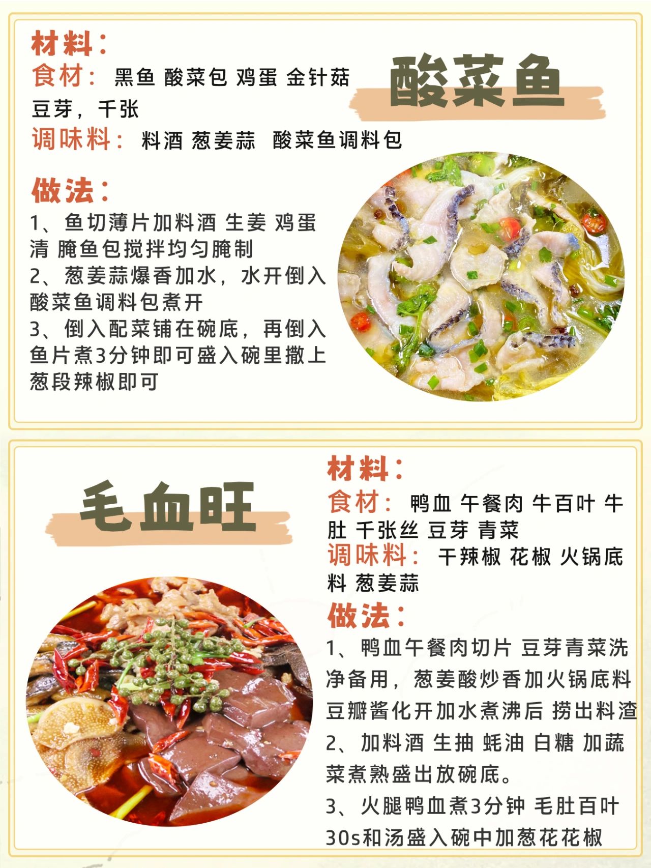 水煮:水煮肉片,金汤肥牛款,酸菜鱼,毛血旺