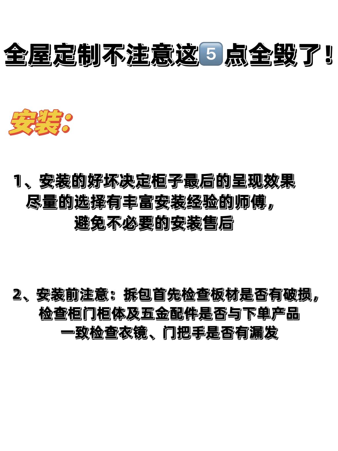 安装前注意:拆包首先检查板材是否有破损,检查柜门柜体及五金配件是否与下单产品一致检查衣镜、门把手是否有漏发。