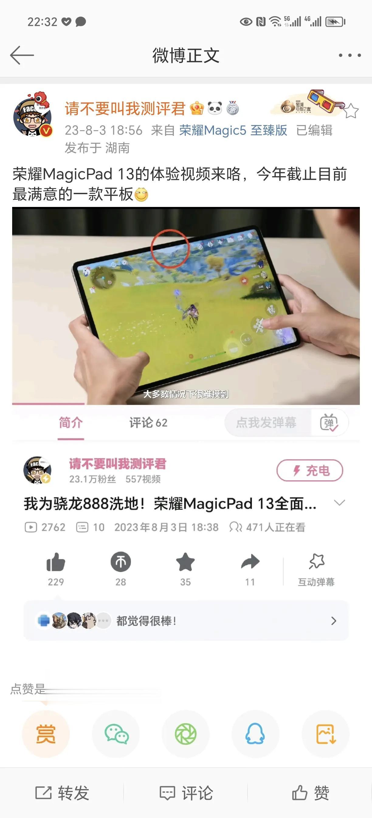 说几句华为或荣耀好,就被某些网友举报,也是够玻璃心的。[捂脸] 荣耀 MagicPad 虽然搭载骁龙888,但综合体验比小米平板 6 Pro 好,办公体验和华为平板相似。然后很多人不信,他们有没有摸过荣耀平板我不知道,但我觉得他们不少人用过骁龙 888,所以觉得荣耀优化也不行吧。