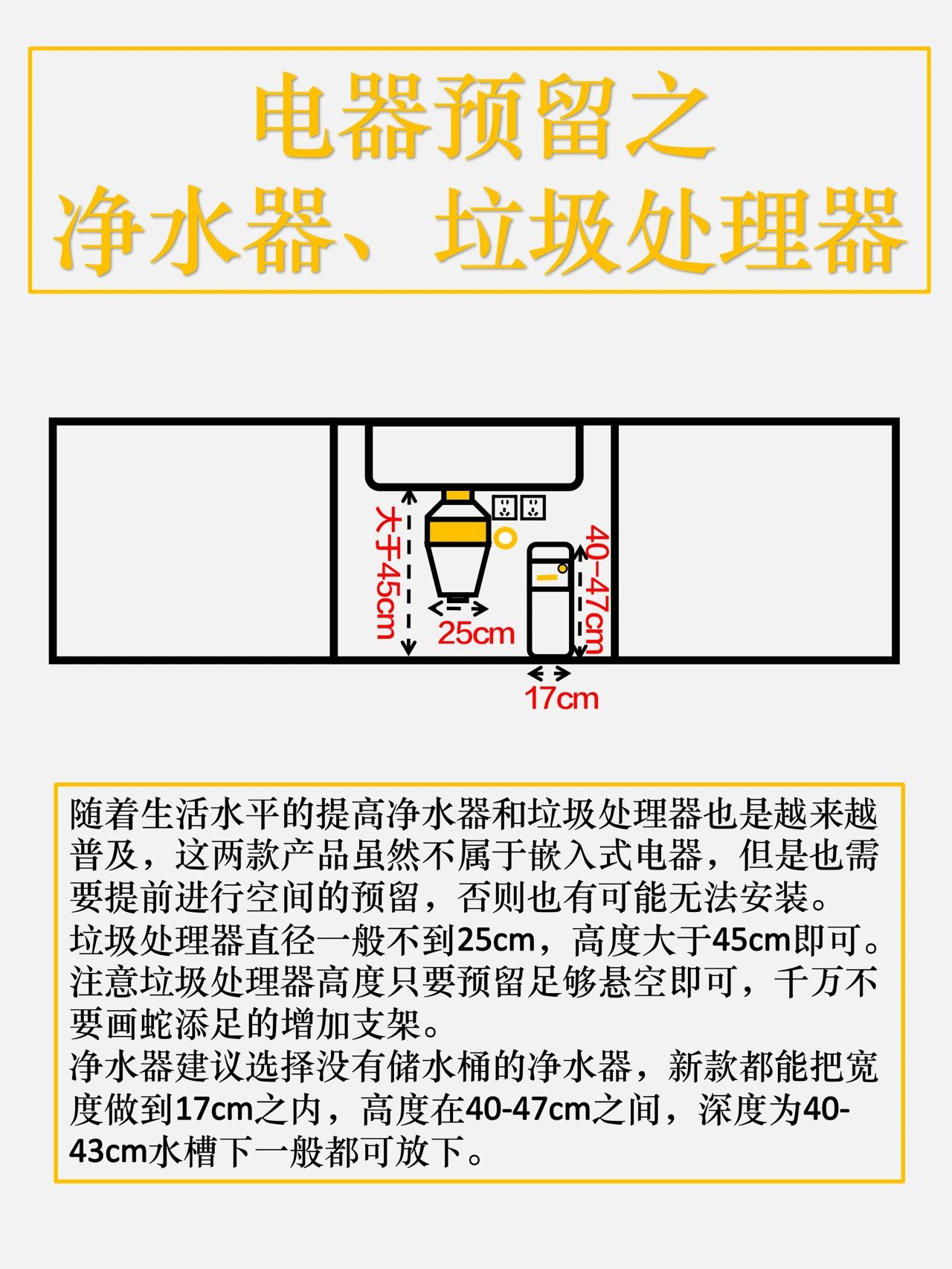 随着生活水平的提高净水器和垃圾处理器也是越来越普及,这两款产品虽然不属于嵌入式电器,但是也需要提前进行空间的预留,否则也有可能无法安装。