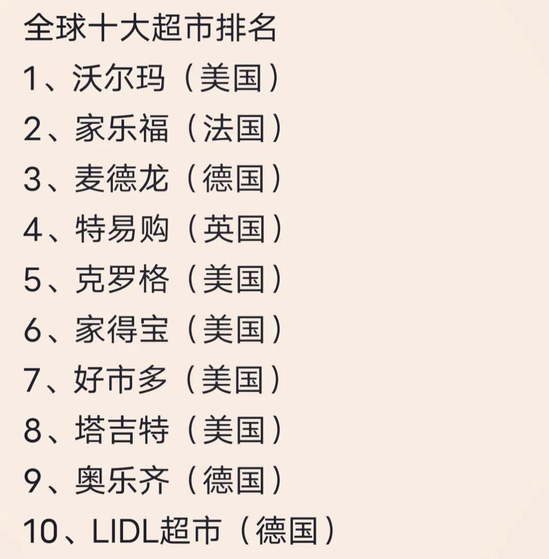 今天才知道全球10大超市排名 以前真不知道小美那么强 看了排名才知道, 啊中没有一个大超市能上排名 这数据一对比 果然小美是发达国家 啊中是发展中,国家好标准, 排名第一是,沃尔玛,超市这个我知道 排名第二的,家乐福,这名字,我还以为是啊中的超市, 会不会是被收购了呀,嘿嘿, 排名第三的,麦德龙,好像听过,哈哈, 排名第四的,没有听过,这是啊中没有,还是小城市没有 排名第五的,家得宝,一样没有听过, 啊中要好好加油了, 我们的国家应该可以有超级大超市吧,