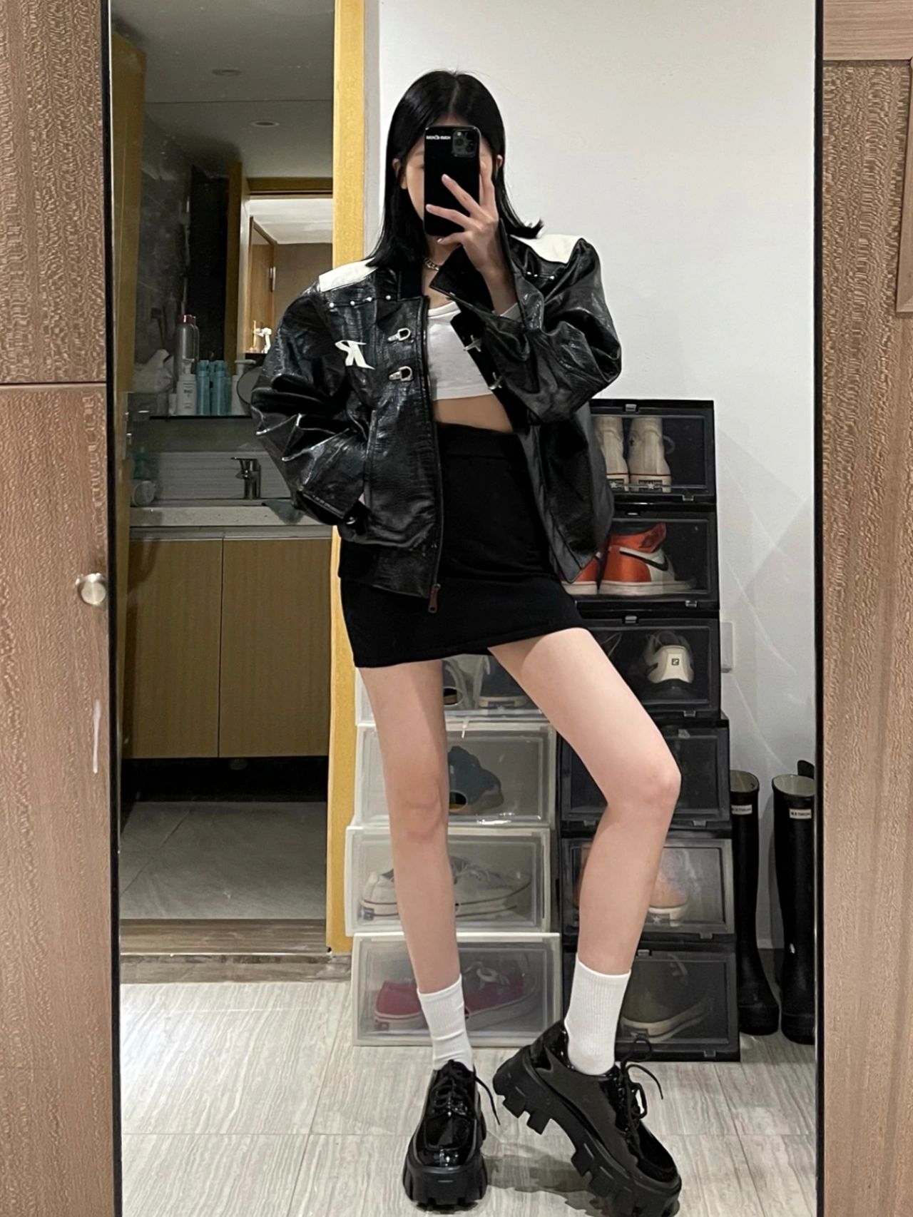 小个子穿搭 又是拽酷拽酷的黑色皮外套