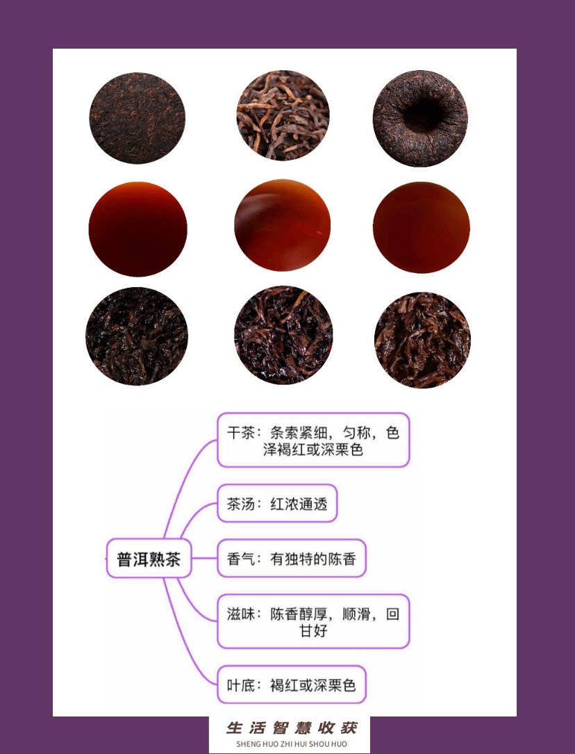 ②普洱熟茶是以符合普洱茶产地环境条件的云南大叶种晒青茶为原料,采用特定工艺,经后发酵(快速后发酵或缓慢后发酵)加工形成的散茶和紧压茶。其品质特征为干茶色泽红褐,内质汤色红浓明亮,香气独特陈香,滋味醇厚回甘,叶底红褐。